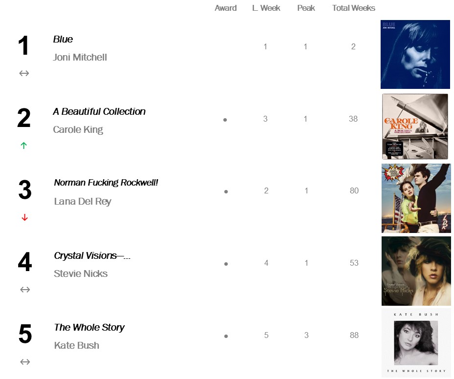 JONI MITCHELL SPENDS SECOND WEEK ATOP TOP CATALOGUE ALBUMS WITH BLUE!