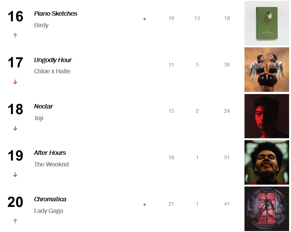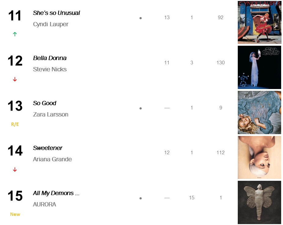 No.15 – All My Demons Greeting Me as a Friend / AURORA’s debut full-length album debuts at No.15 on Top Catalogue Albums (selling 6,000 copies) in celebration of its five-year anniversary. Demons earns the Norwegian singer her third Top Twenty hit, following the No.6 peaking EP Infections of a Different Kind and her No.2 hit album A Different Kind of Human. The latter set retreats 17-20 this week.