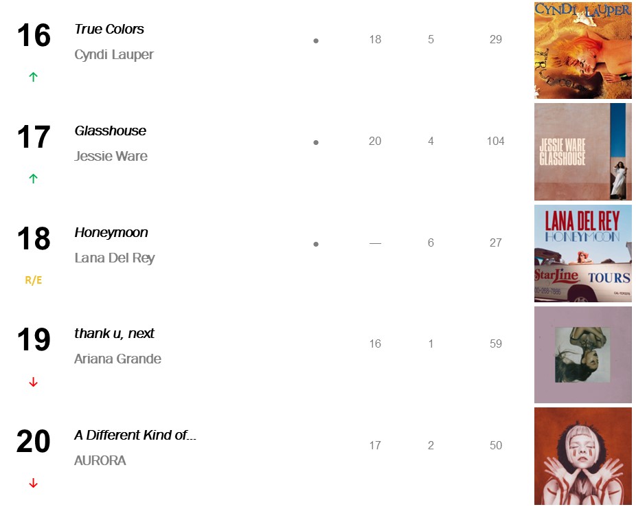 No.18 – Honeymoon / Lana Del Rey’s 2015 set re-enters at No.18 (selling 6,000 units), marking its first charting week on Top Catalogue Albums, and first showing since mid-2020. The Gold-certified set re-enters in anticipation of Del Rey’s upcoming album Chemtrails Over the Country Club – due March 19th.