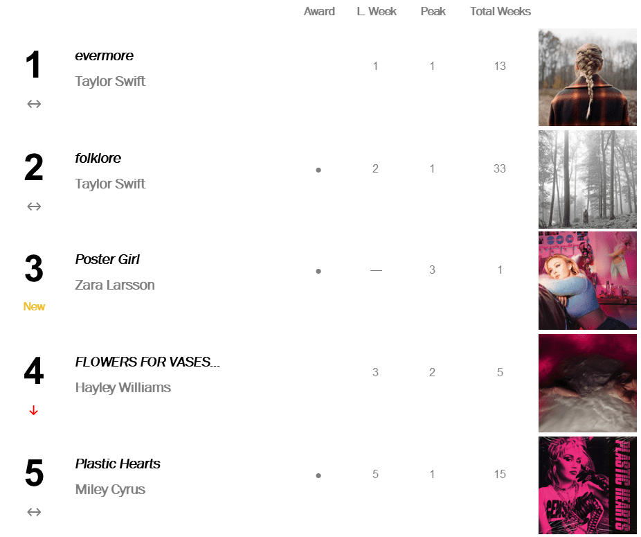 Swift commands Top Contemporary Albums for thirteenth week with evermore; Zara Larsson’s Poster Girl launches at No.3.