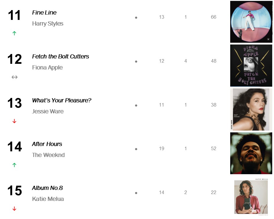 No.12 – Fetch the Bolt Cutters / After winning Best Alternative Music Album, Fiona Apple’s masterpiece Fetch the Bolt Cutters surges by 62 percent to 13,000 sold. The album peaked at No.4 in April last year.