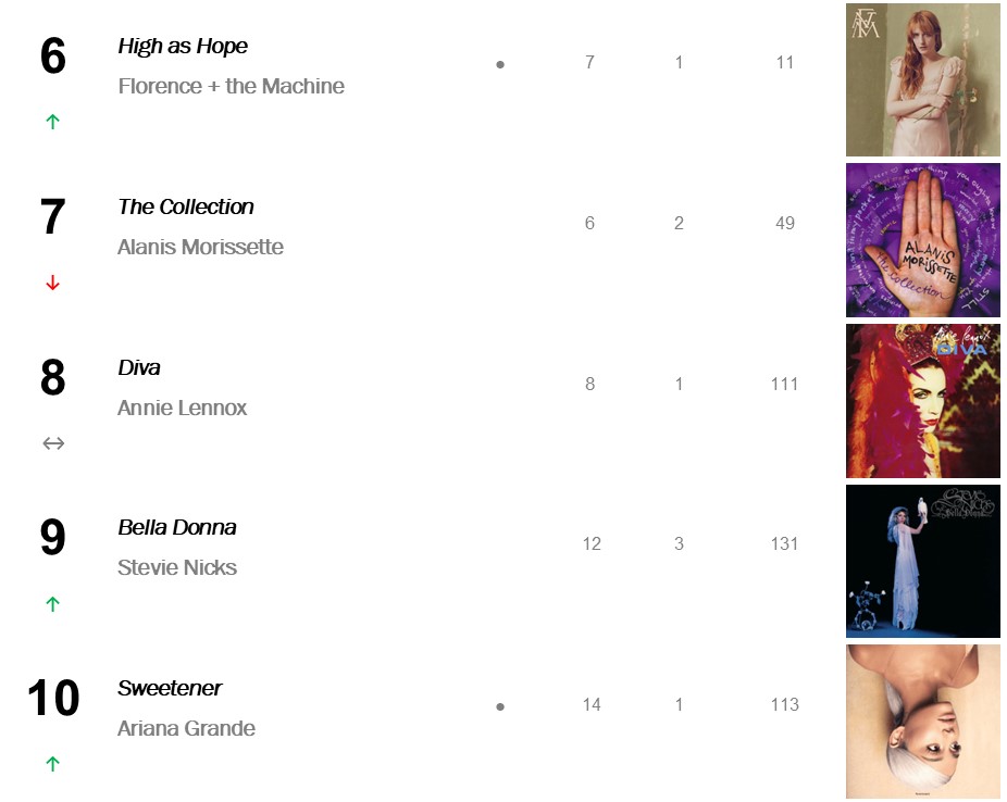 Florence + the Machine’s former chart-topping High as Hope ticks 7-6 (13,000 – up 18 percent); Alanis Morissette’s The Collection slips 6-7 (12,000 – even with last week) after peaking at No.2 for nine weeks.
