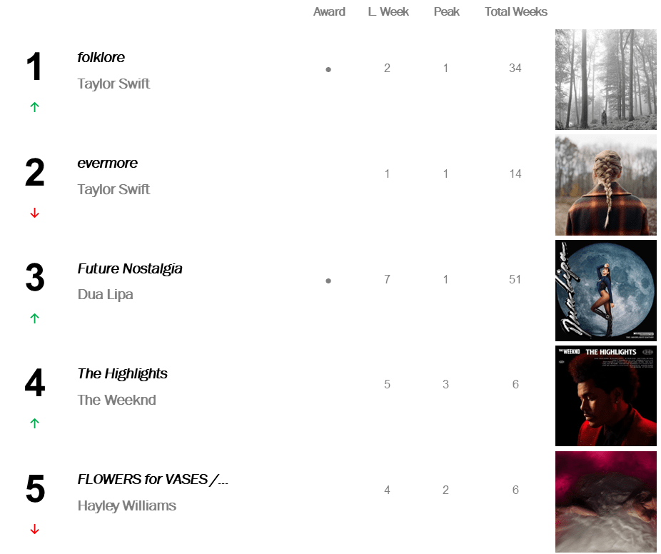 As Taylor Swift replaces herself at No.1, and makes history with folklore; Dua Lipa’s Future Nostalgia re-enters the Top Five, and Lady Gaga’s Chromatica re-enters Top Ten!