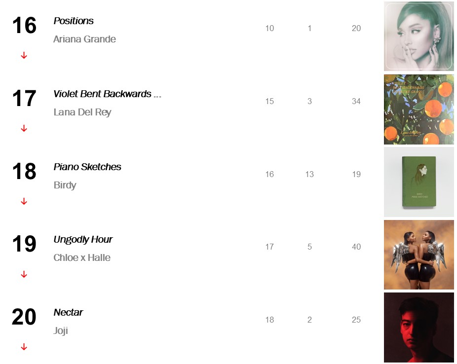 No.11 – Fine Line / Harry Styles’s sophomore album rises 13-11 after its single “Watermelon Sugar” took home the prize for Best Pop Solo Performance. The album moved 13,000 units this week (up 62 percent). Previously, Fine spent a single week at the top spot in December 2019.