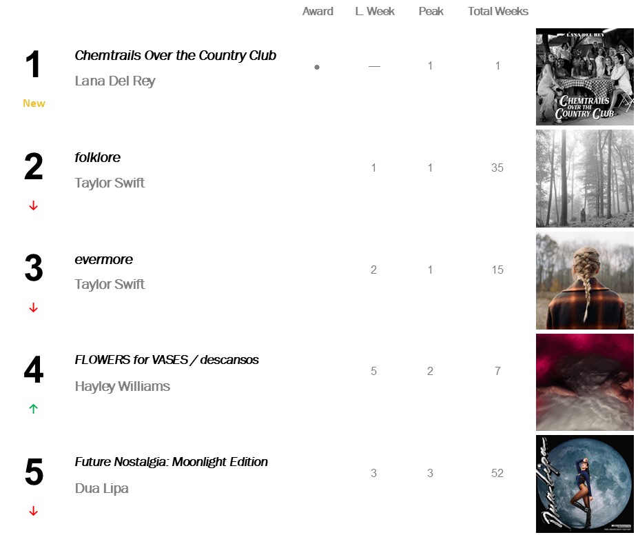 Onto Next Week: Lana Del Rey’s Chemtrails Over the Country Club should easily take out a second week at No.1, possibly with sales of over 100,000 units.