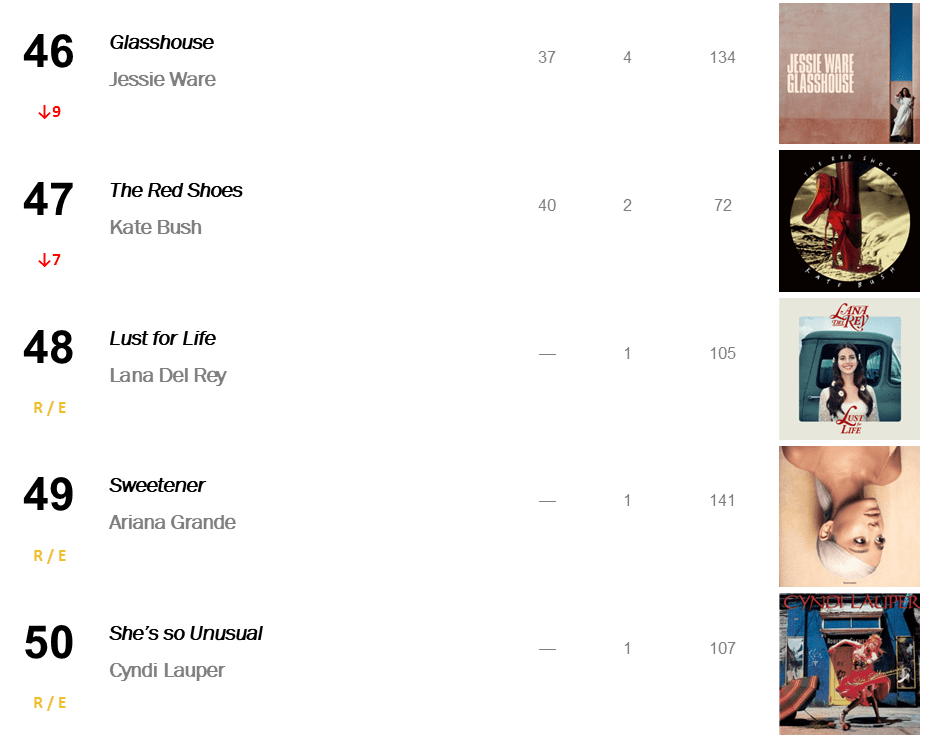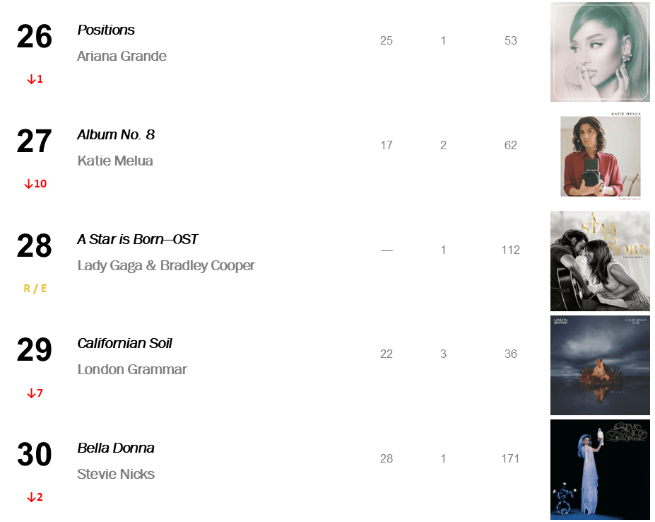 No.26 – Positions / Ariana Grande’s late-2020 smash has now topped sales of 1.2 million copies, becoming the singer’s third album to do so following Sweetener and thank u, next; those albums have been certified 7 x Platinum and 4 x Platinum respectively.