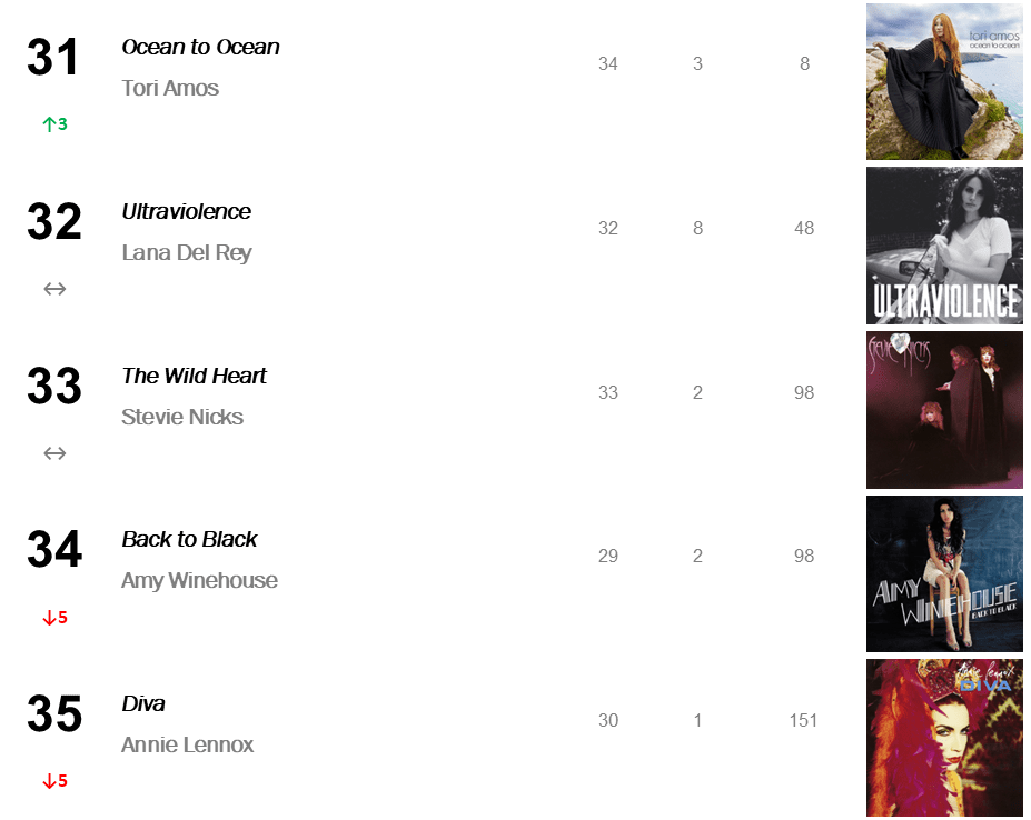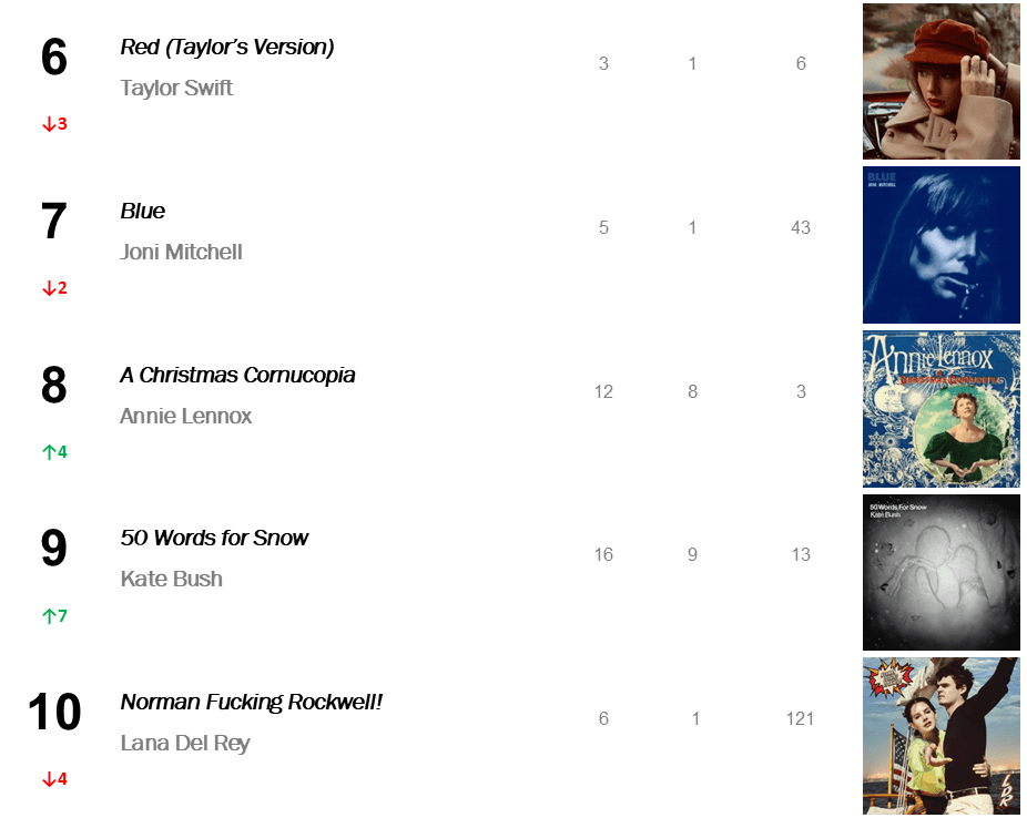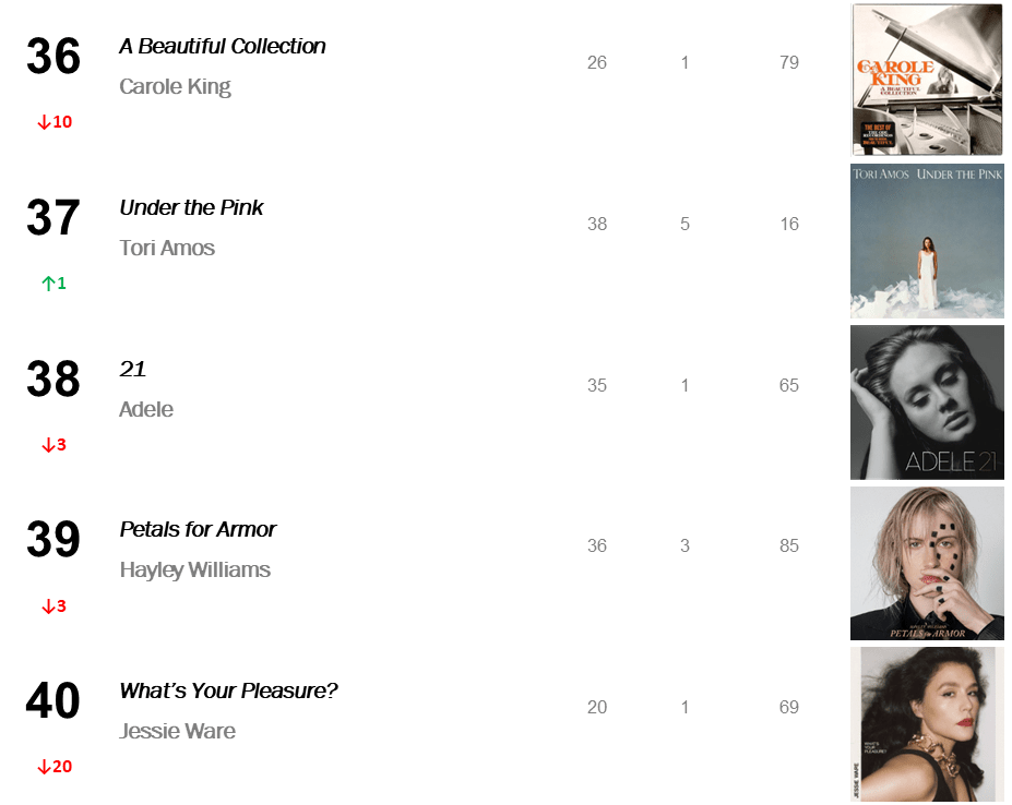 Finally, Joni Mitchell’s iconic set Blue descends 5-7, selling a further 28,000 copies (up twenty-one percent).