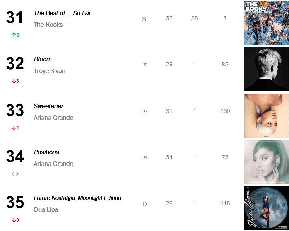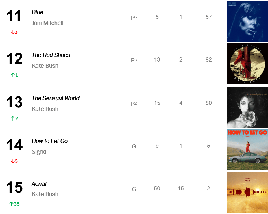 Onto Next Week: Joni Mitchell’s Court and Spark could claim a second week at number-one, with the album currently aiming to sell over 80,000 for a third week. Kate Bush’s Hounds of Love should prove tough competition though, as it could sell anywhere between 75 – 85,000 units.
