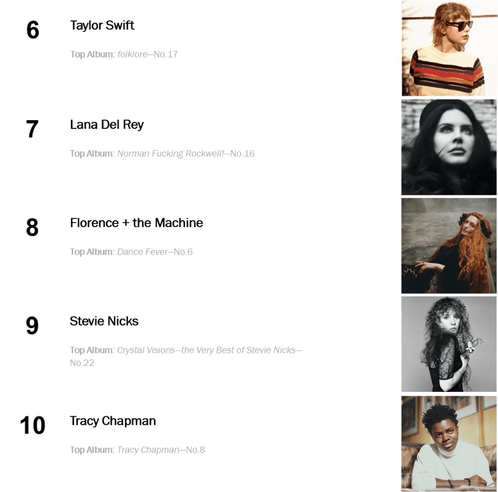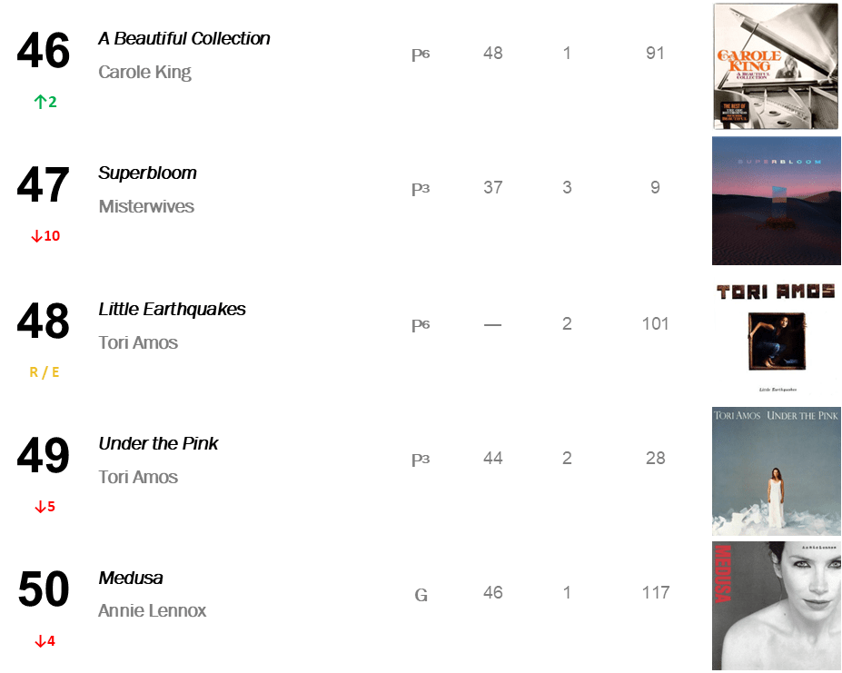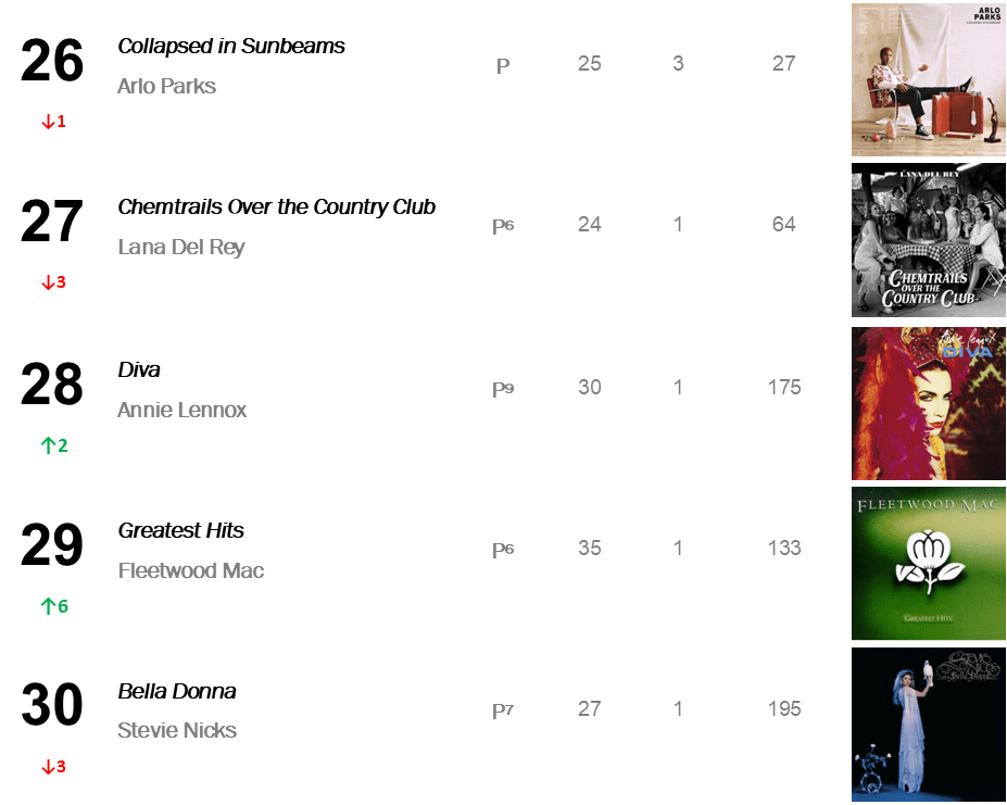 A trio of chart-toppers sits just outside the Top Five: Florence + the Machine are steady at No.6 with Dance Fever (28,000 units – down 24 percent); Tracy Chapman’s self-titled debut sinks 7-8 (26,000 units – down 7 percent); Sam Fender’s Seventeen Going Under rebounds 10-9 (23,000 units – up 4 percent).