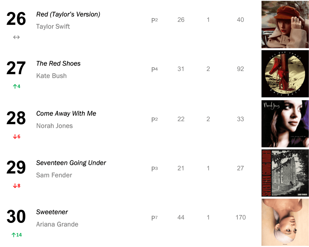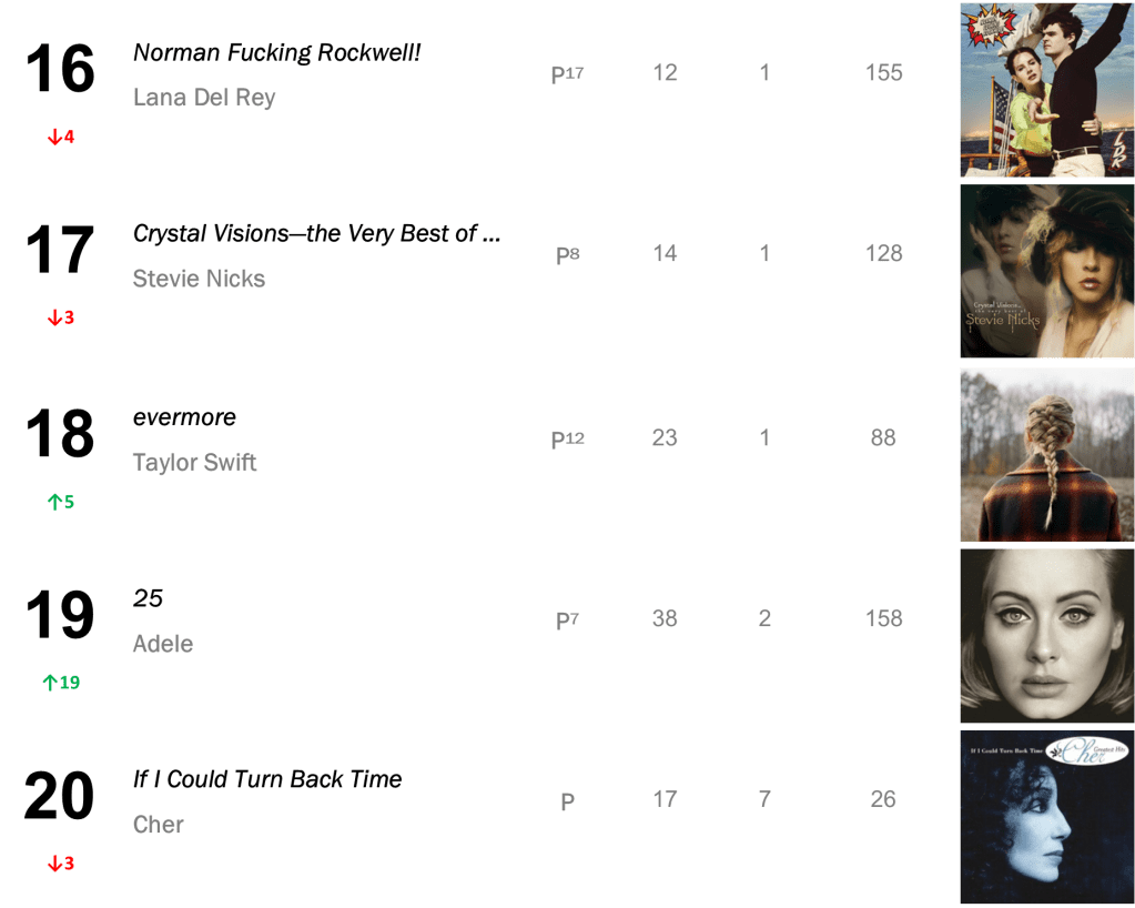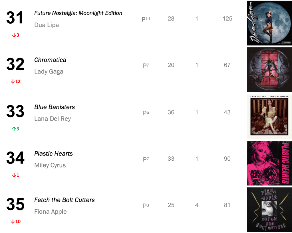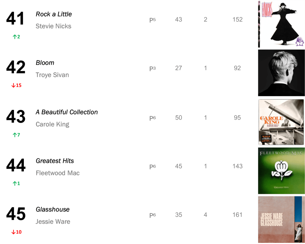 Onto Next Week: Maggie Roger’s Surrender is currently tracking for a third week at the top spot, likely with sales of over 75,000 copies. Joni Mitchell’s Court and Spark could also return for a sixth term in charge, with over 70,000 sold.