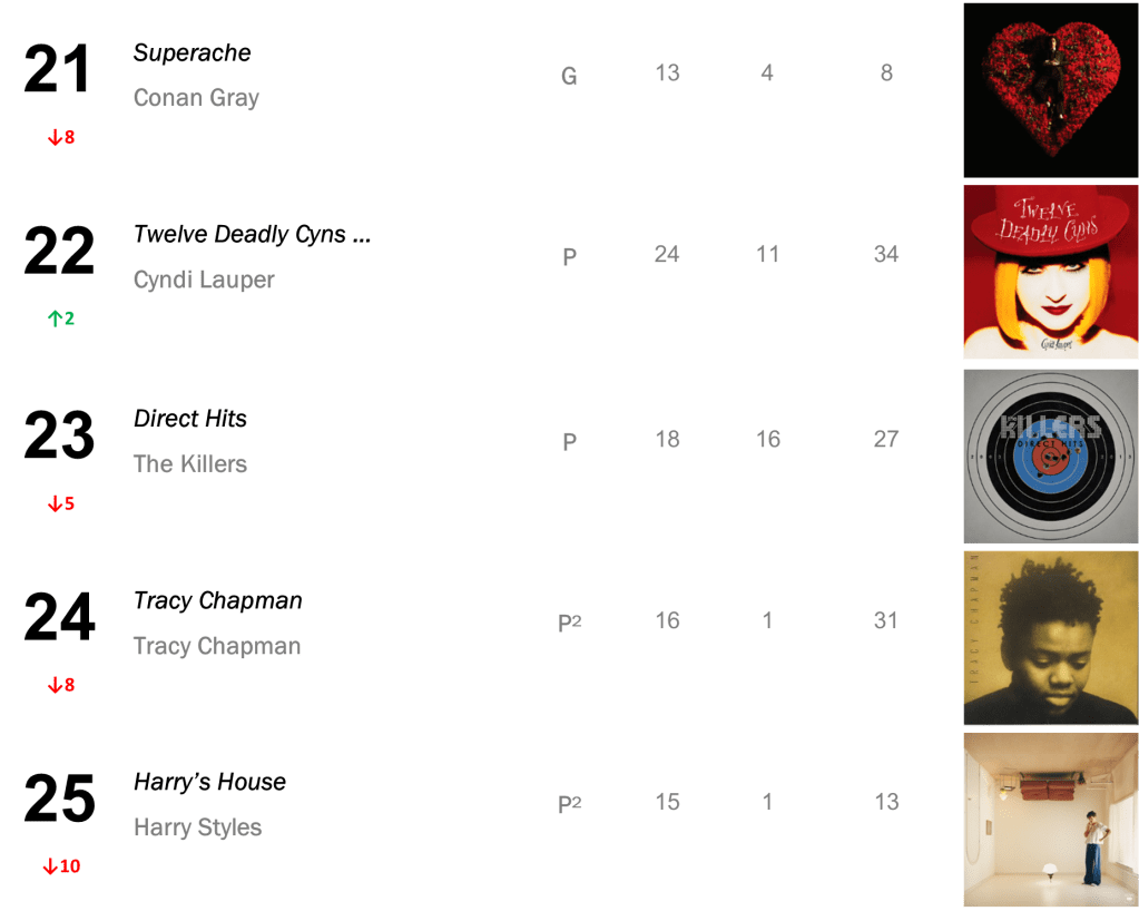 Outside the Top Five: Kate Bush’s The Whole Story bullets at No.6 (27,000 units – up 3 percent); Florence + the Machine’s Dance Fever inches 8-7 (24,000 units – on par with last week); and Lizzo drops 7-9 with Special (22,000 units – down 11 percent).