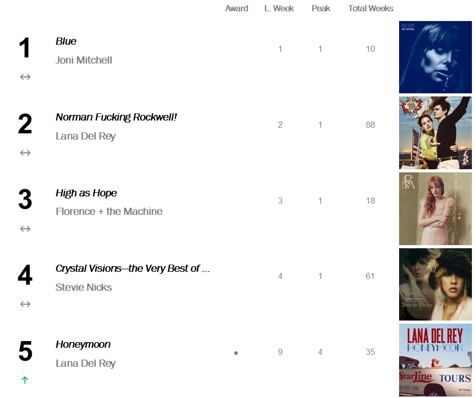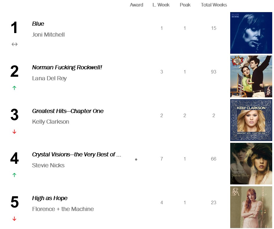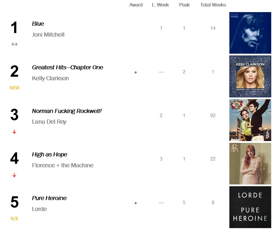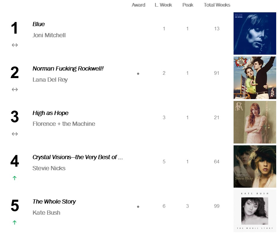Onto Next Week: Joni Mitchell’s Blue could tie Lana Del Rey’s Norman Fucking Rockwell! as the longest-running number-one album of all time, as it celebrates its fiftieth anniversary! The album looks set to move upwards of 40,000 units.