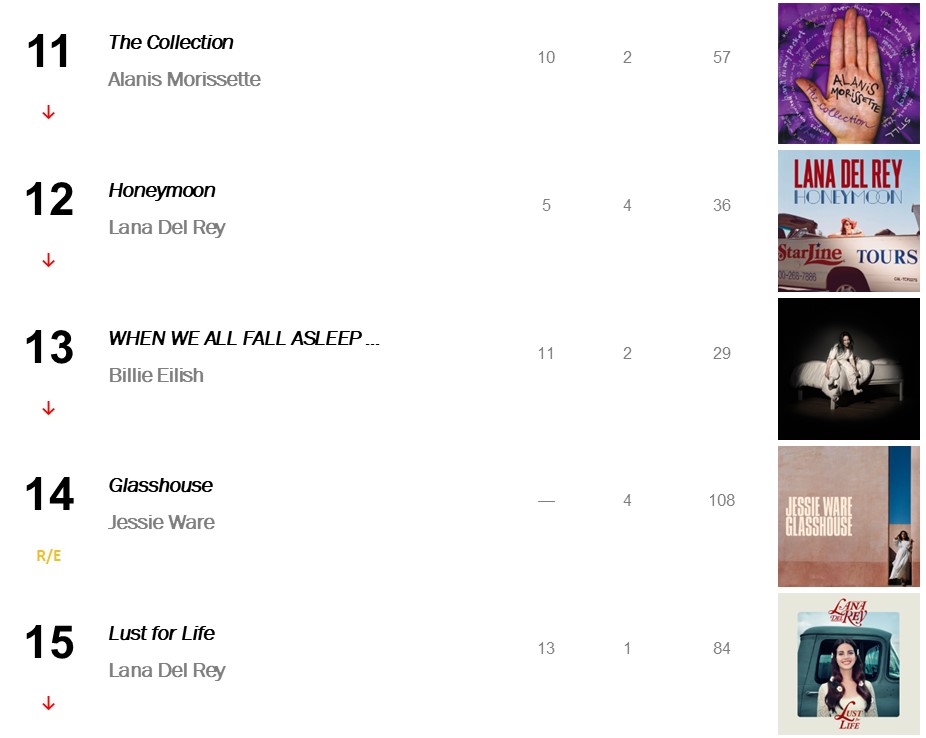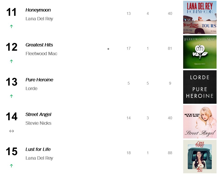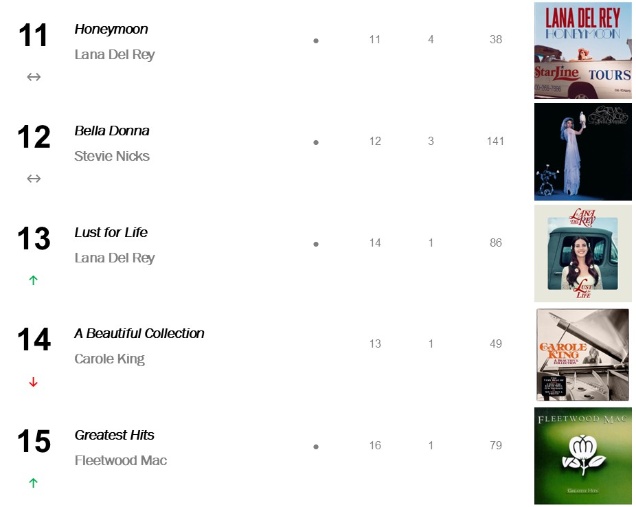 - Lana Del Rey – Lust for Life (2.65 million); Norman Fucking Rockwell! (4.13 million); Chemtrails Over the Country Club (1.02 million).