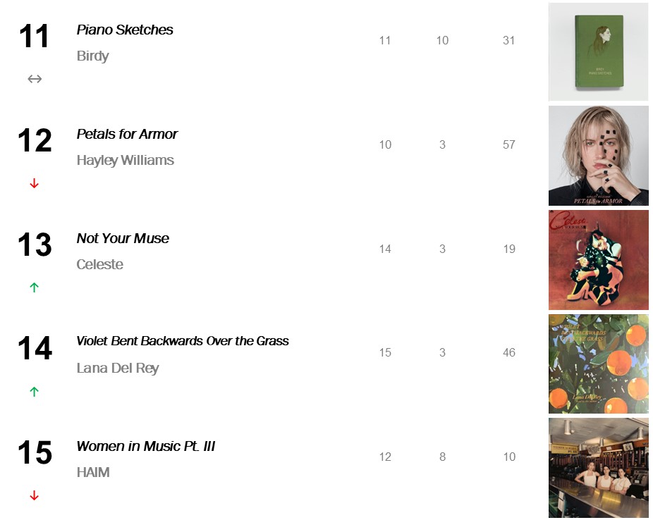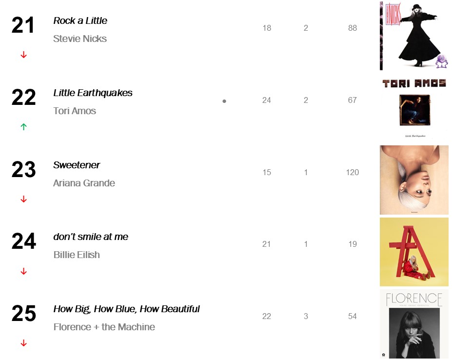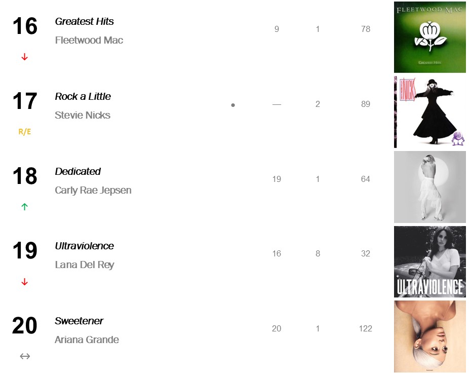 Her 2013 debut Pure Heroine zooms from No.14 to No.2, reaching a new peak on L.dK Weekly; the album sold 28,000 copies this week, leaping 250 percent from the previous week’s hauls. 2017’s five-week leader Melodrama surges 16-3 on sales of 25,000 units (up 257 percent).