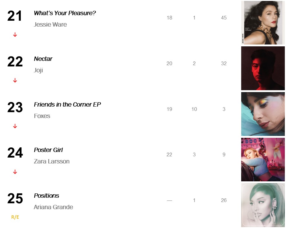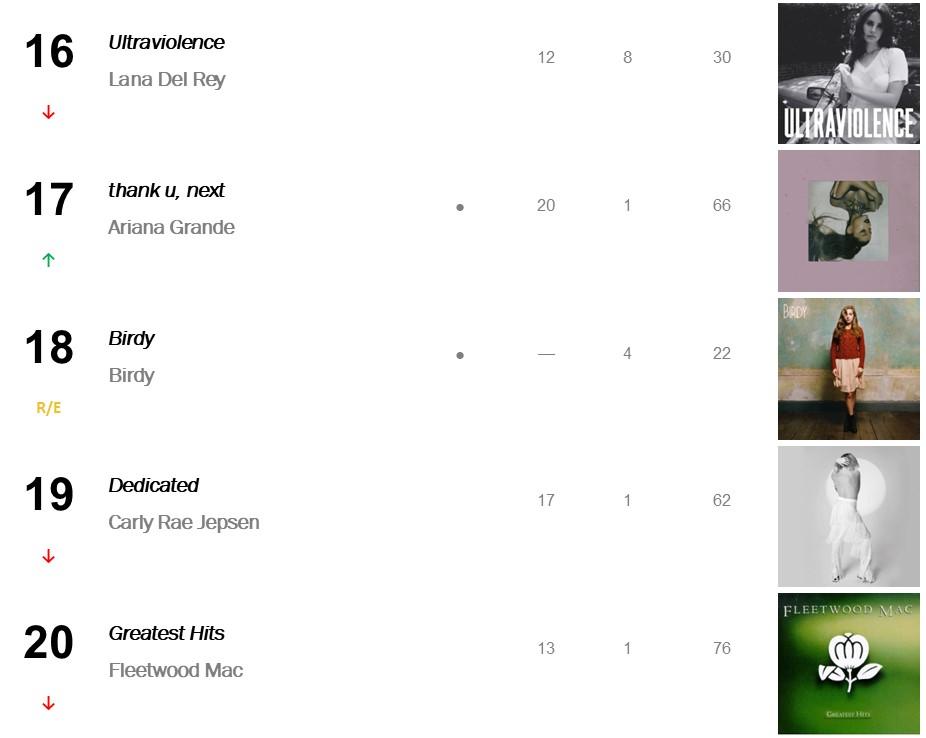 - Ariana Grande – Sweetener (2.01 million); thank u, next (1.34 million); Positions (1.02 million).