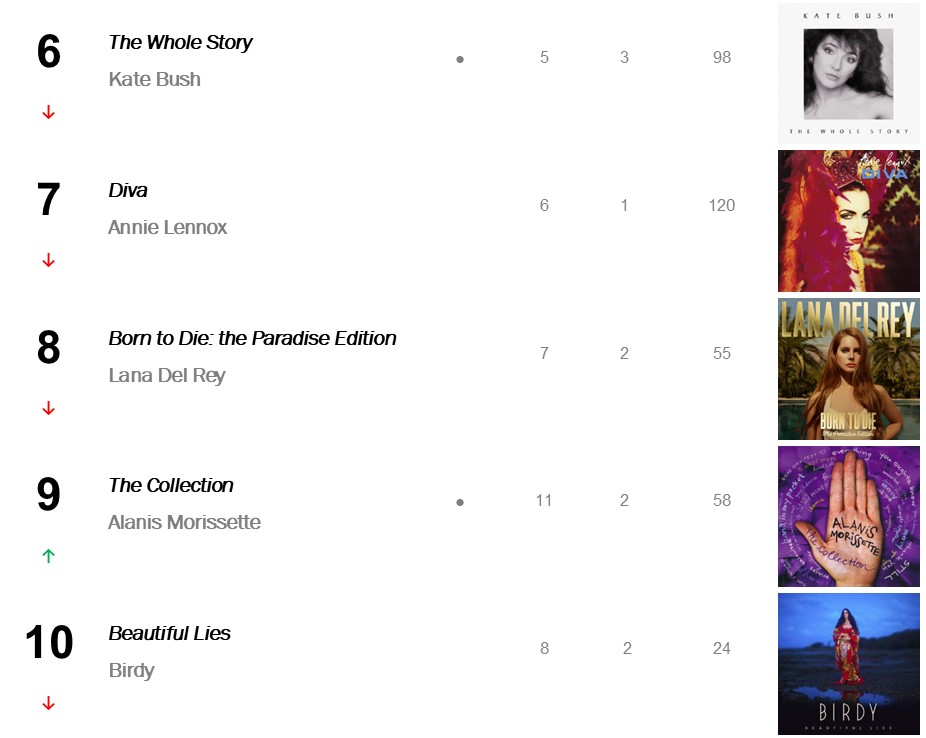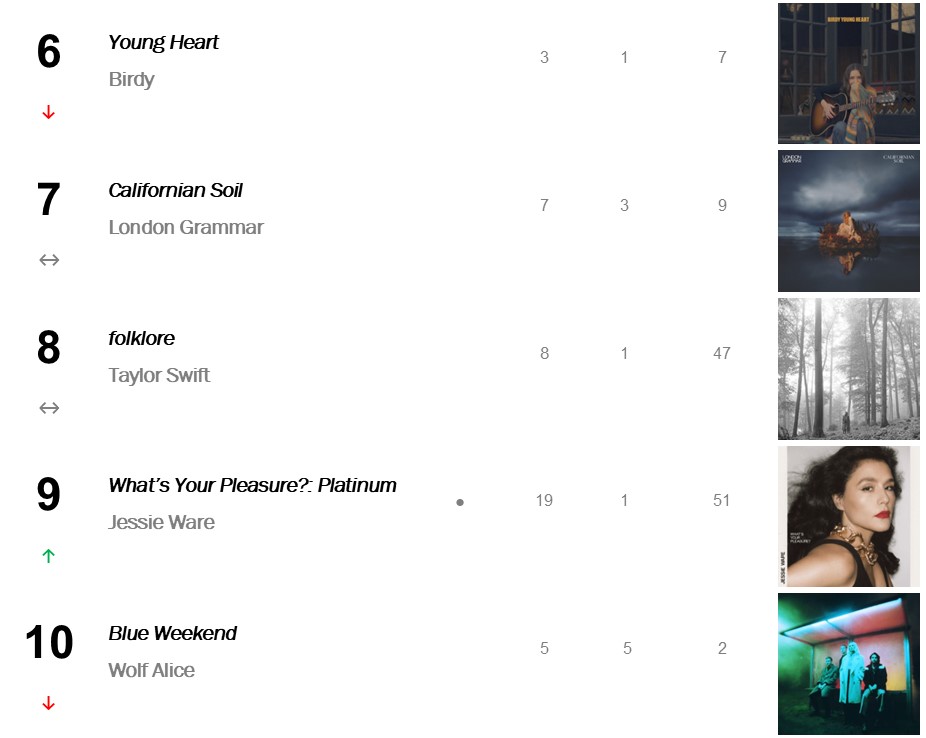 Florence + the Machine’s former number-one High as Hope slides 5-8 (14,000 units – down seven percent).