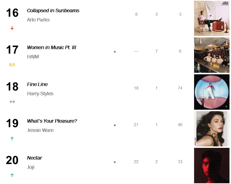 Jessie Ware’s What’s Your Pleasure? returns to the Top Ten at No.9 (up from No.19) as it surges by 266 percent in sales to 22,000 sold following the release of the Platinum Pleasure Edition.