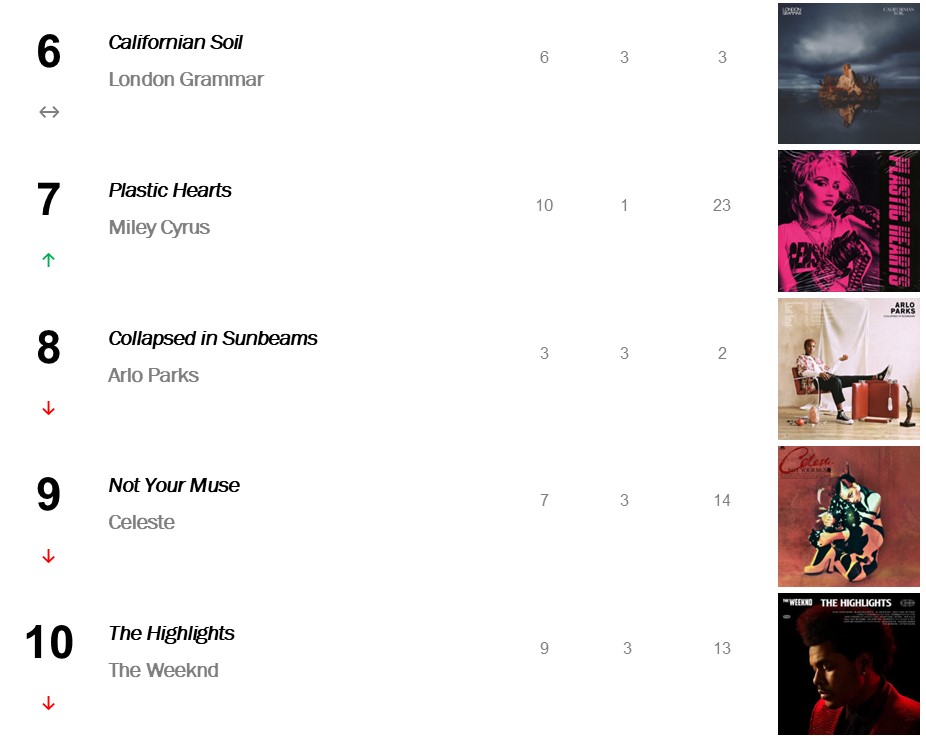 Outside the Top Five: Birdy’s number-one hit Young Heart slides 3-6 (36,000 units – down 17 percent); London Grammar’s No.3-peaking Californian Soil stays at No.7 (26,000 units – down 4 percent).