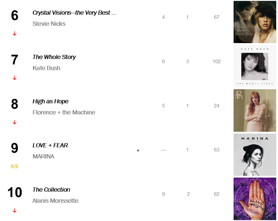 MARINA jumps back onto Top Catalogue Albums at No.9, with LOVE + FEAR selling 14,000 units (up from a negligible figure last week). LOVE previously spent seven weeks at number-one on the discontinued Weekly Top Fifty and has sold 1.96 million copies to date.