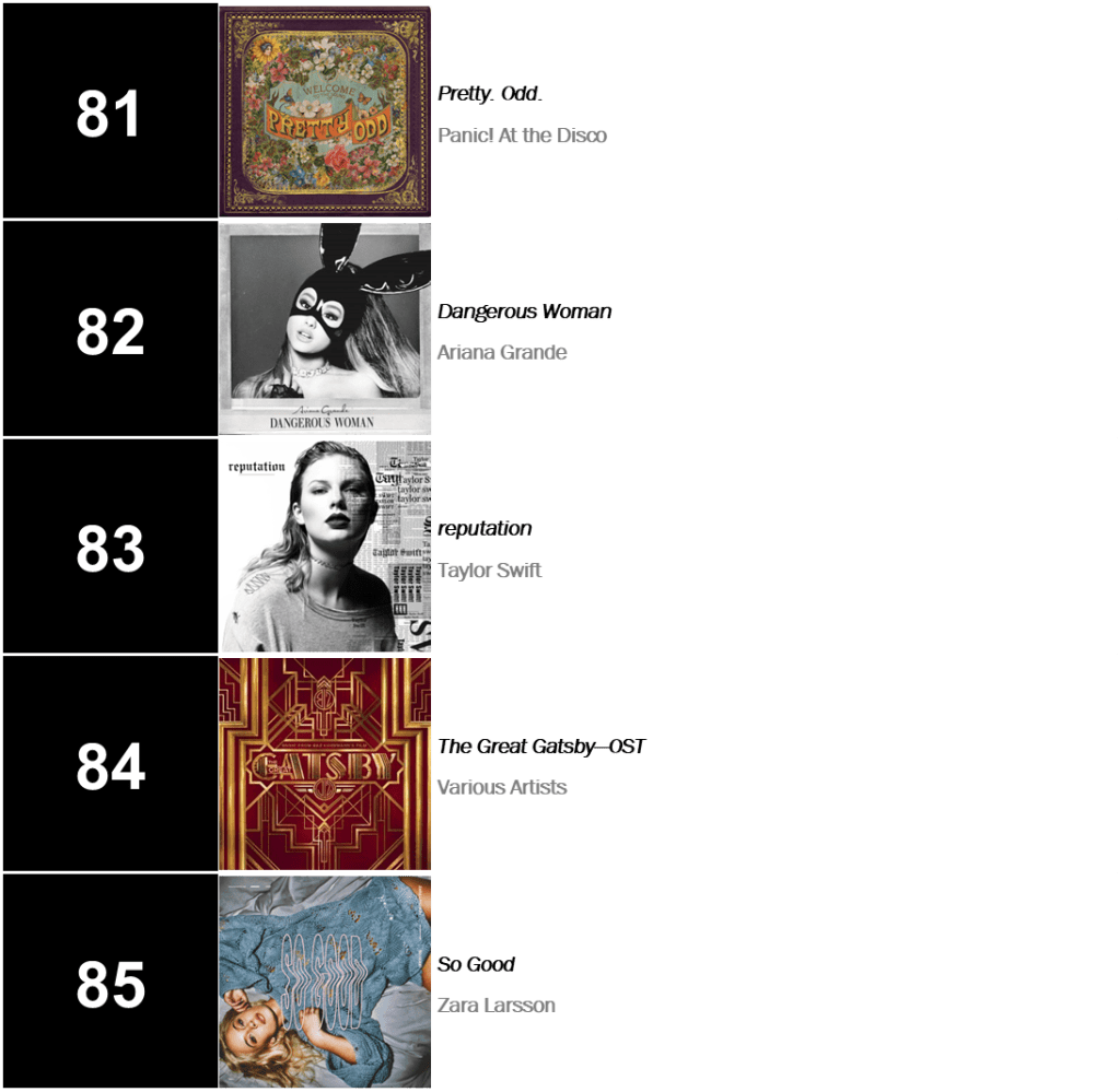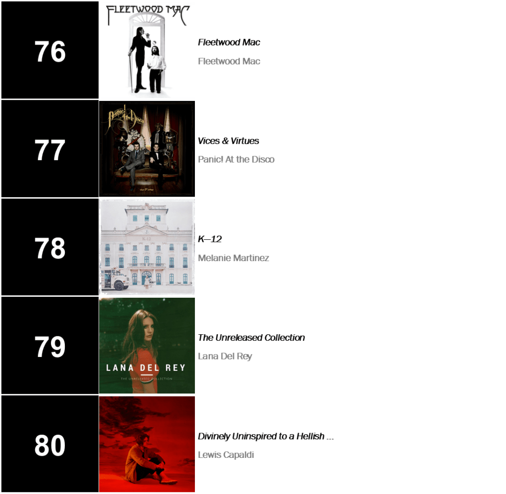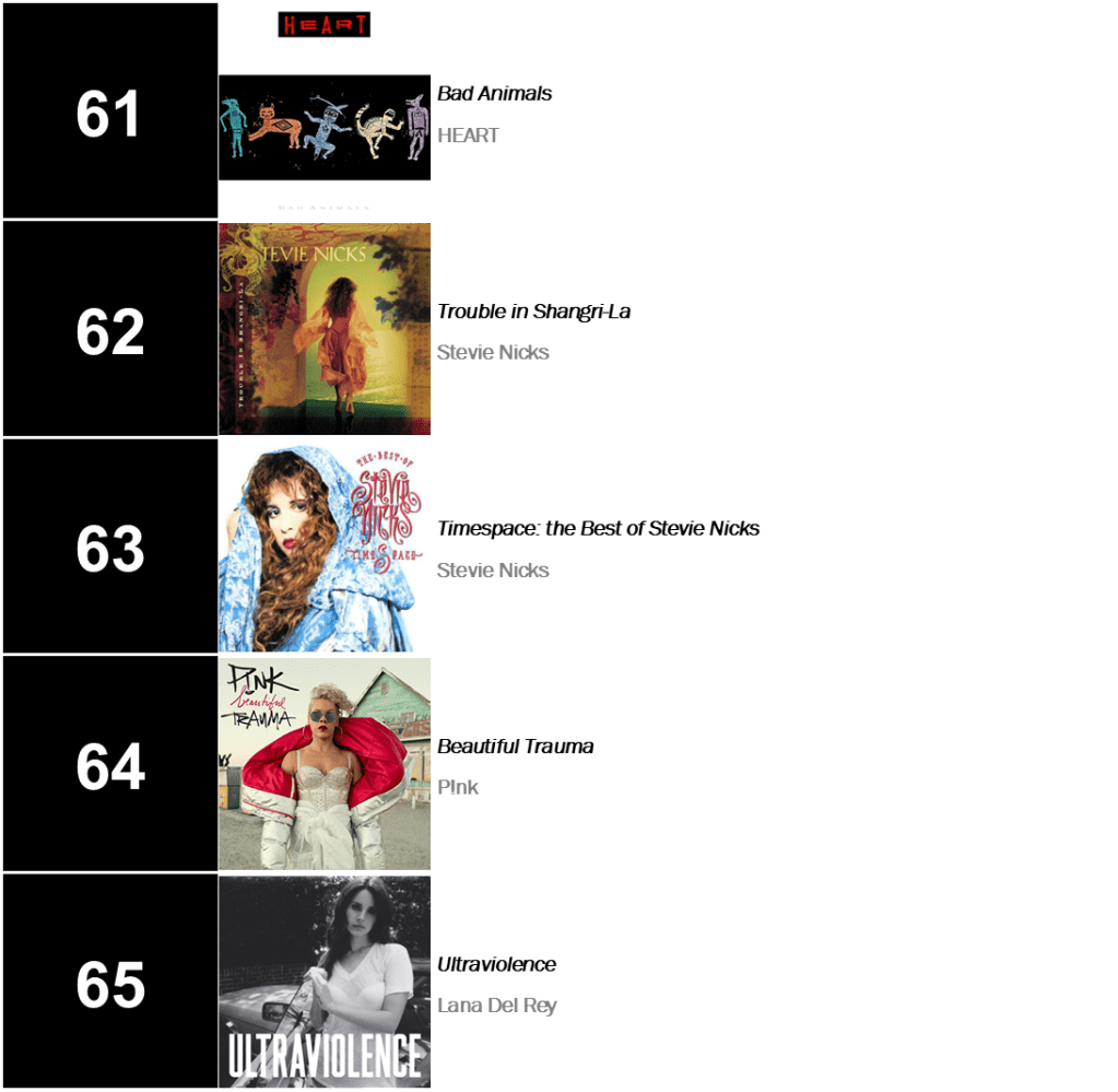 The record has spent its entire 28-week-tenure inside the Top Five, matching it with Del Rey’s own Lust for Life: both sets lag behind Star which has logged 31 weeks in the region.