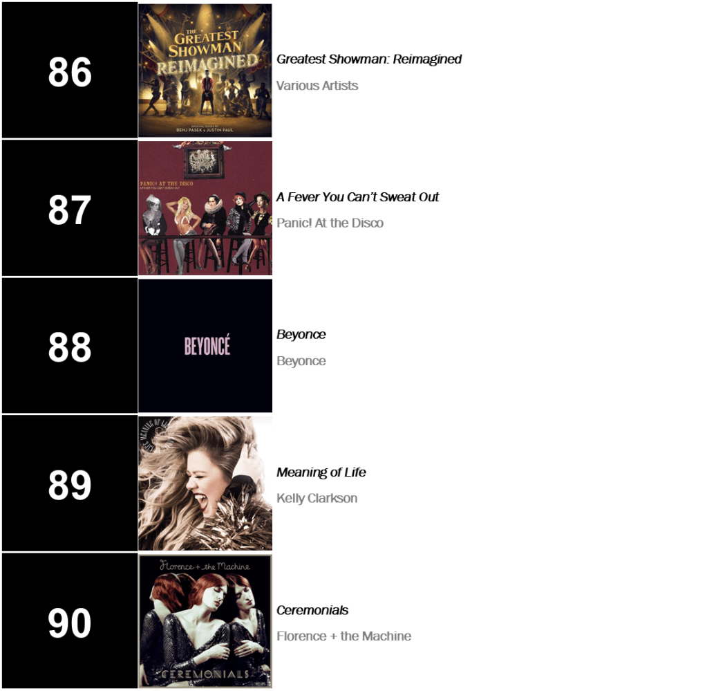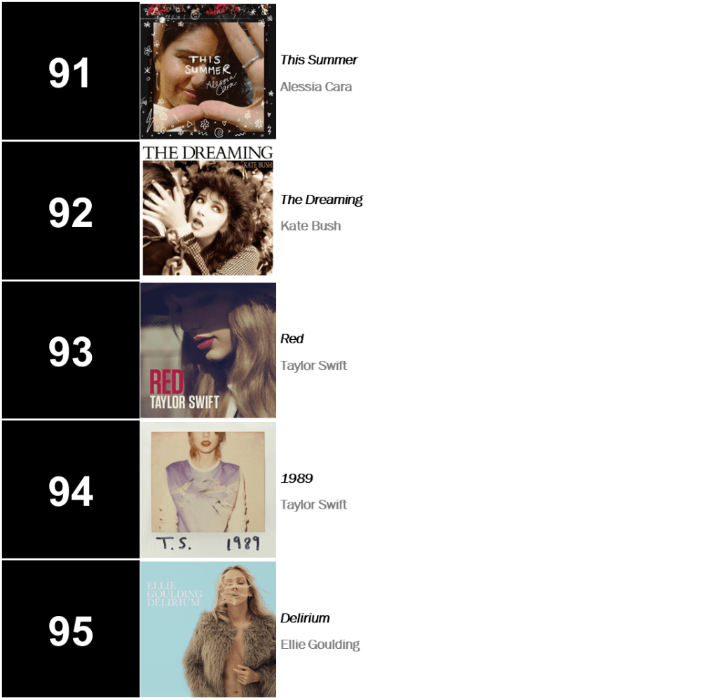Halsey’s Manic stays put at No.4 (31,000); Selena Gomez’ Rare ascends 7-5 (27,000); Taylor Swift leaps 9-6 with Lover (26,000) and Annie Lennox springs 10-7 with Medusa (25,000).