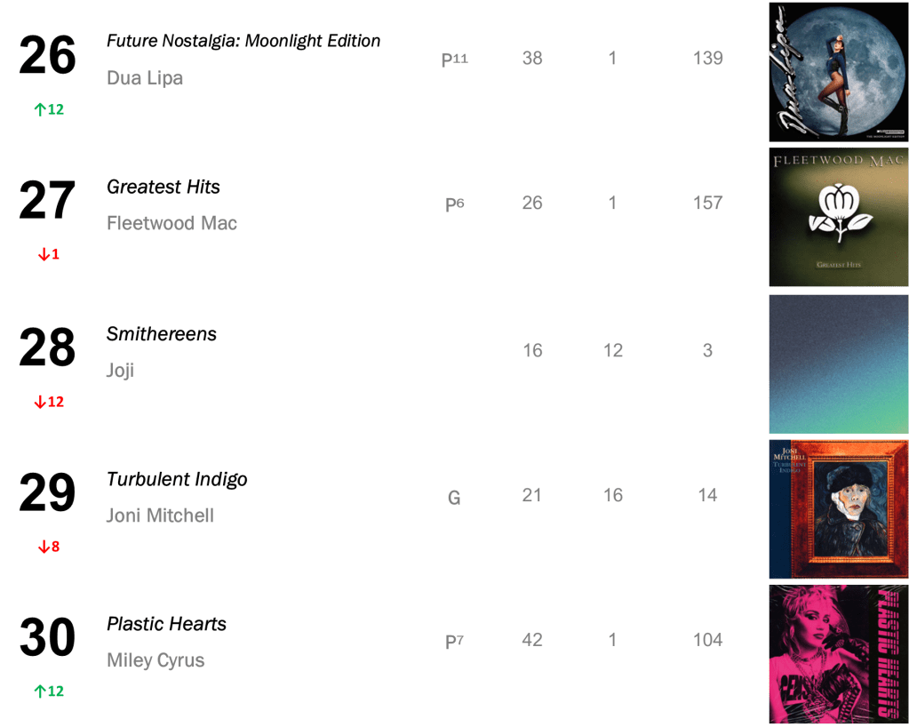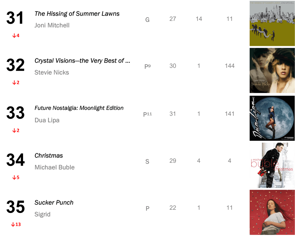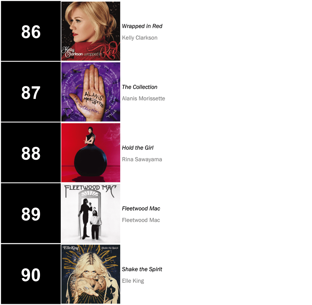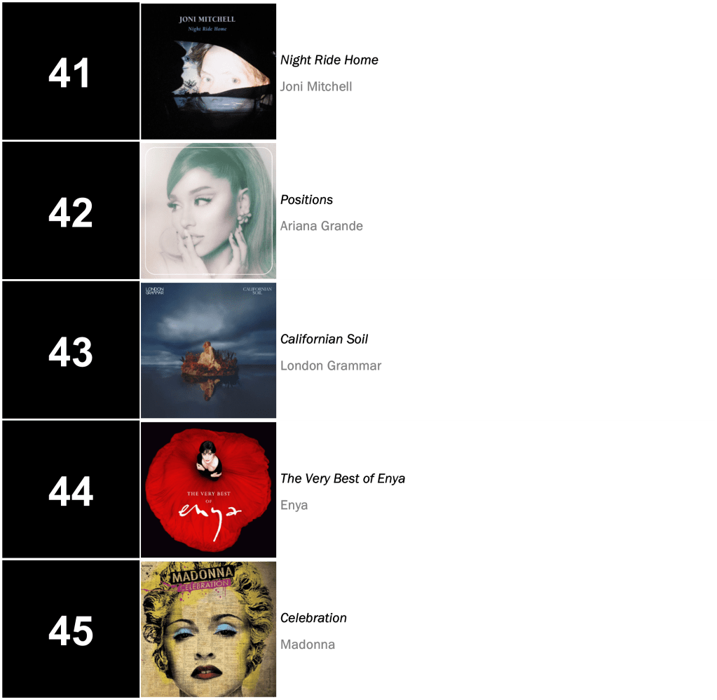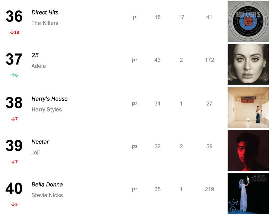 No.13 – Plastic Hearts / Miley Cyrus’s late-2020 smash hit hits its highest rank since March 2022, selling 16,000 copies in the wake of Cyrus’s new single “Flowers”. Cryus also places at No.25 with SHE IS COMING (10,000 sold); No.35 with Bangerz (8,000 sold); and No.43 with Younger Now (7,000 sold).