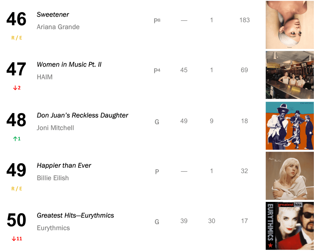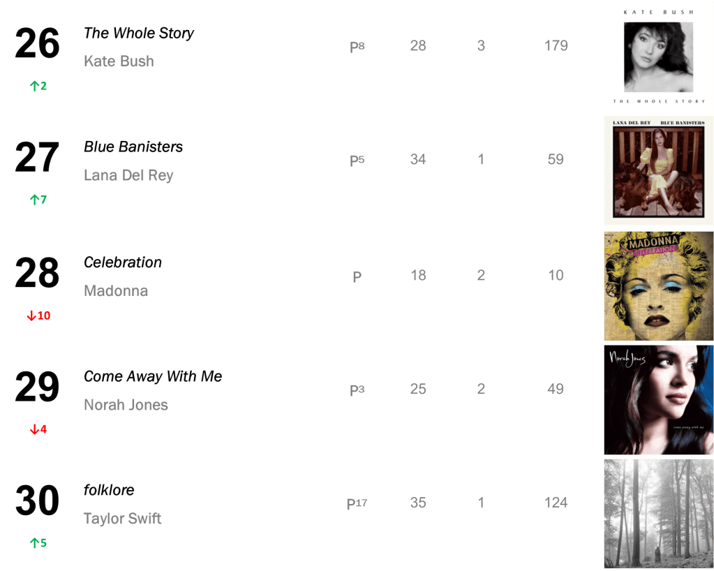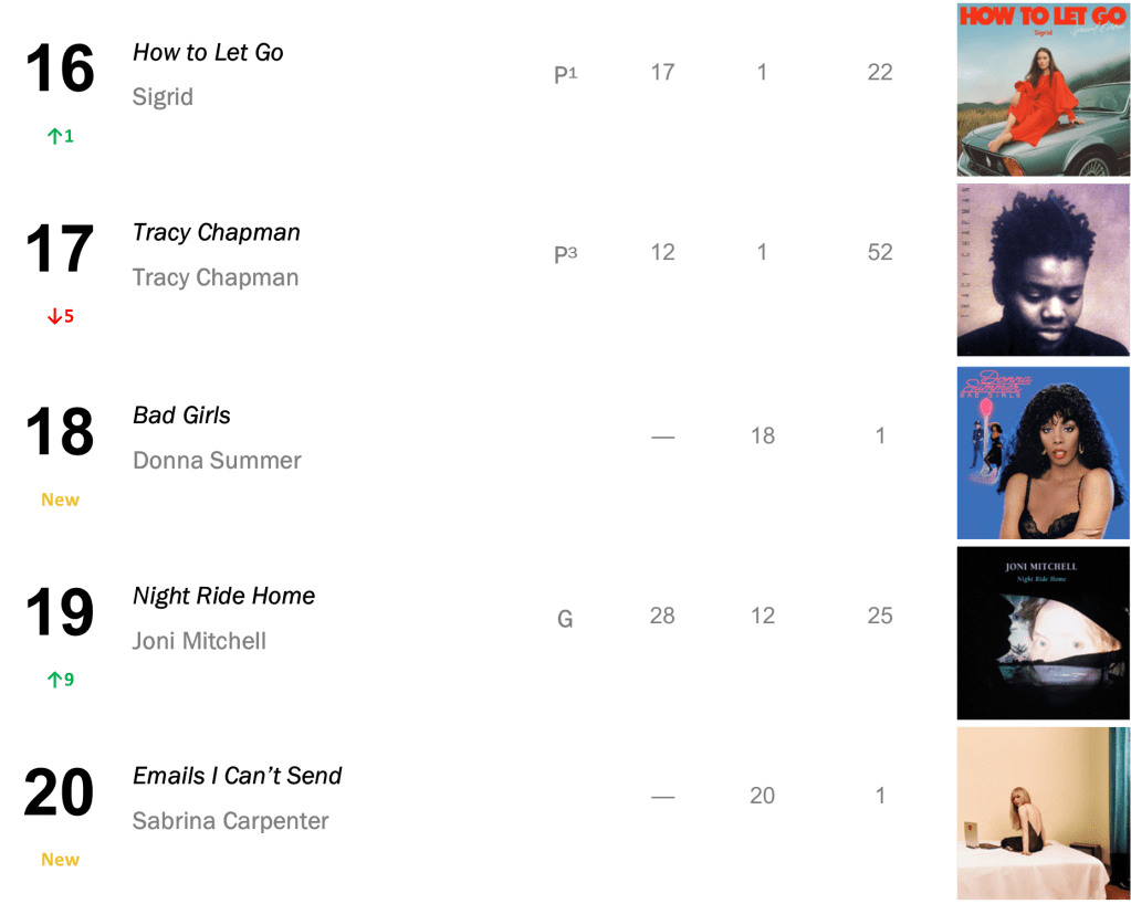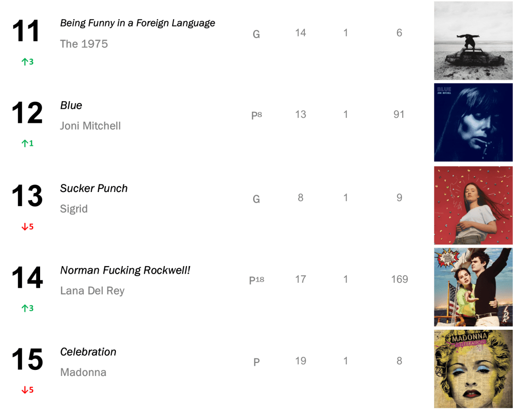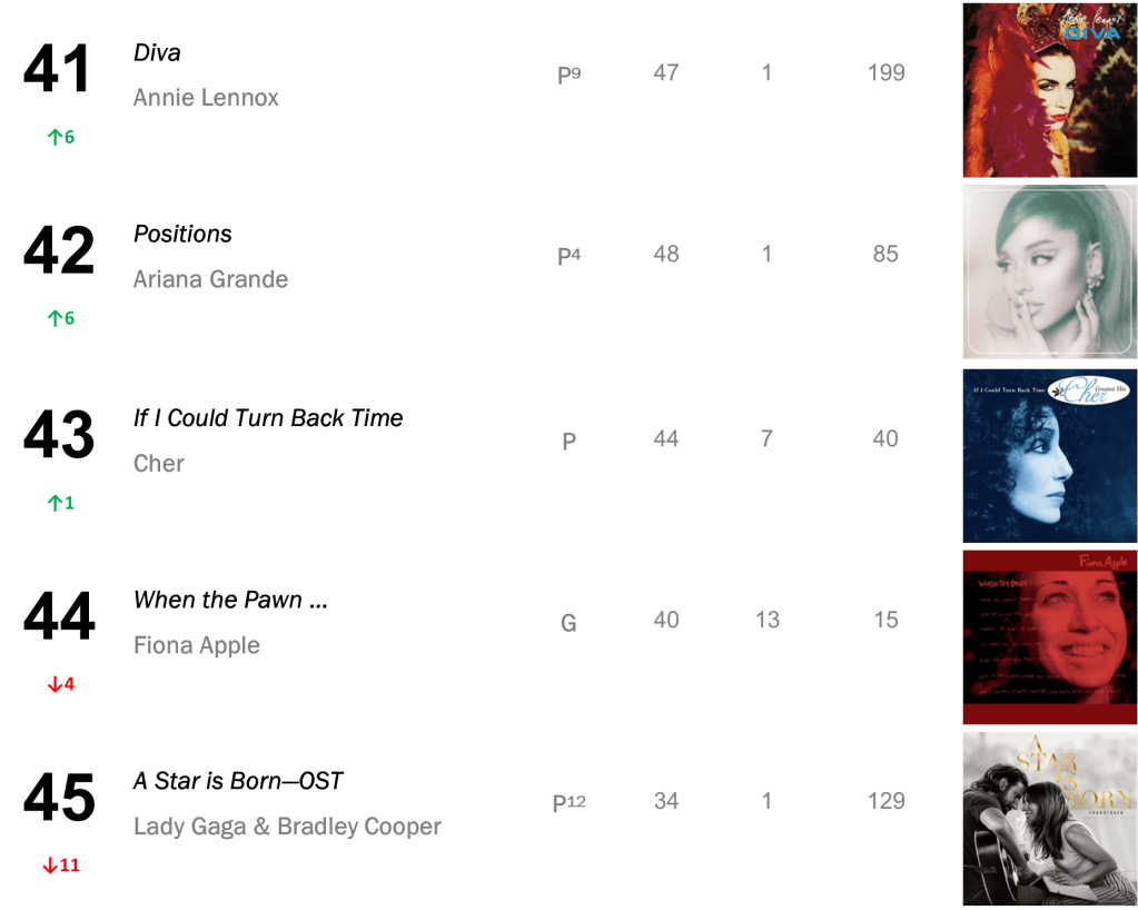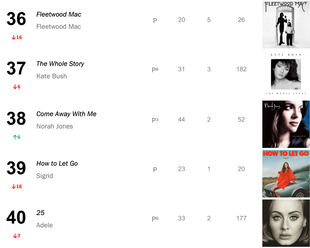No.13 – Plastic Hearts / Miley Cyrus’s late-2020 smash hit hits its highest rank since March 2022, selling 16,000 copies in the wake of Cyrus’s new single “Flowers”. Cryus also places at No.25 with SHE IS COMING (10,000 sold); No.35 with Bangerz (8,000 sold); and No.43 with Younger Now (7,000 sold).