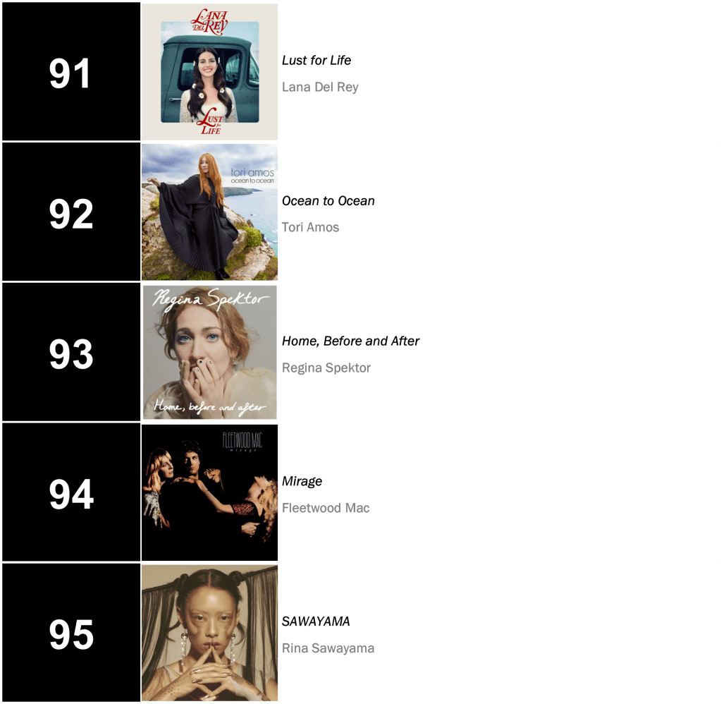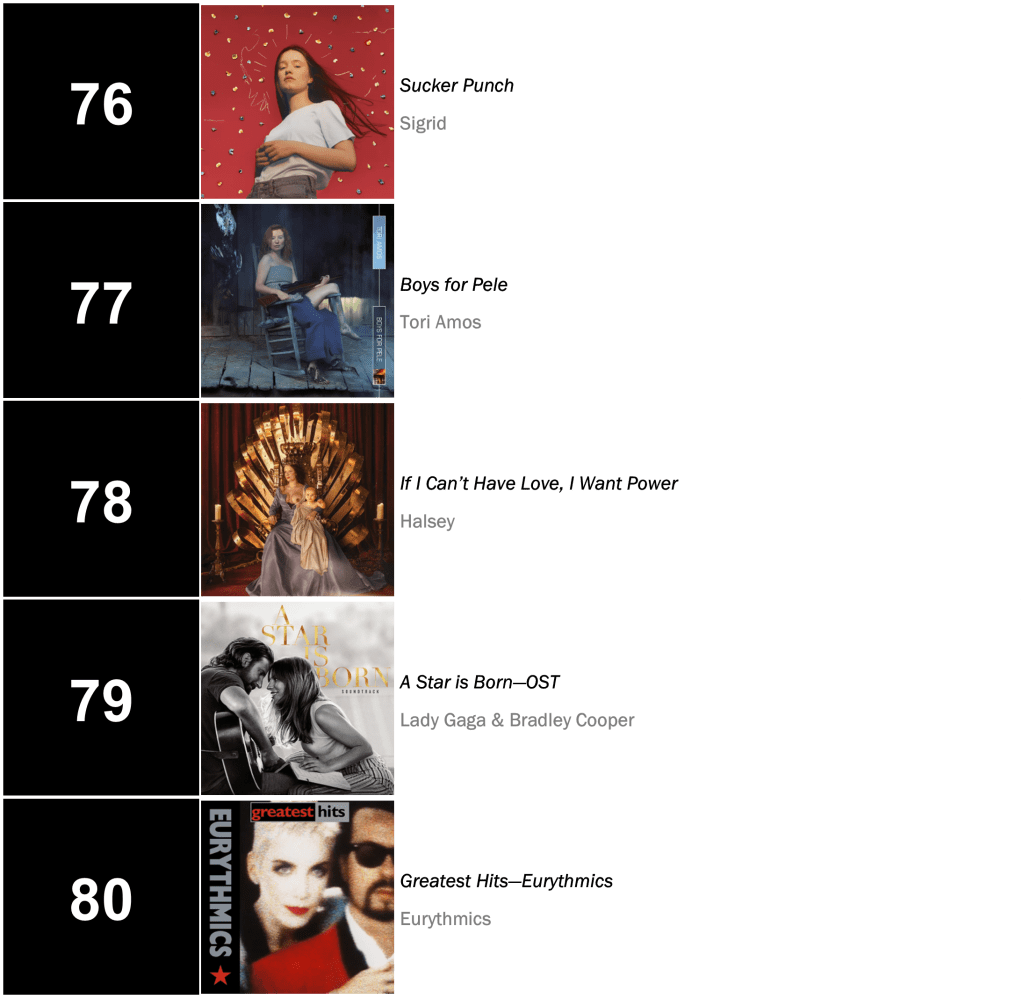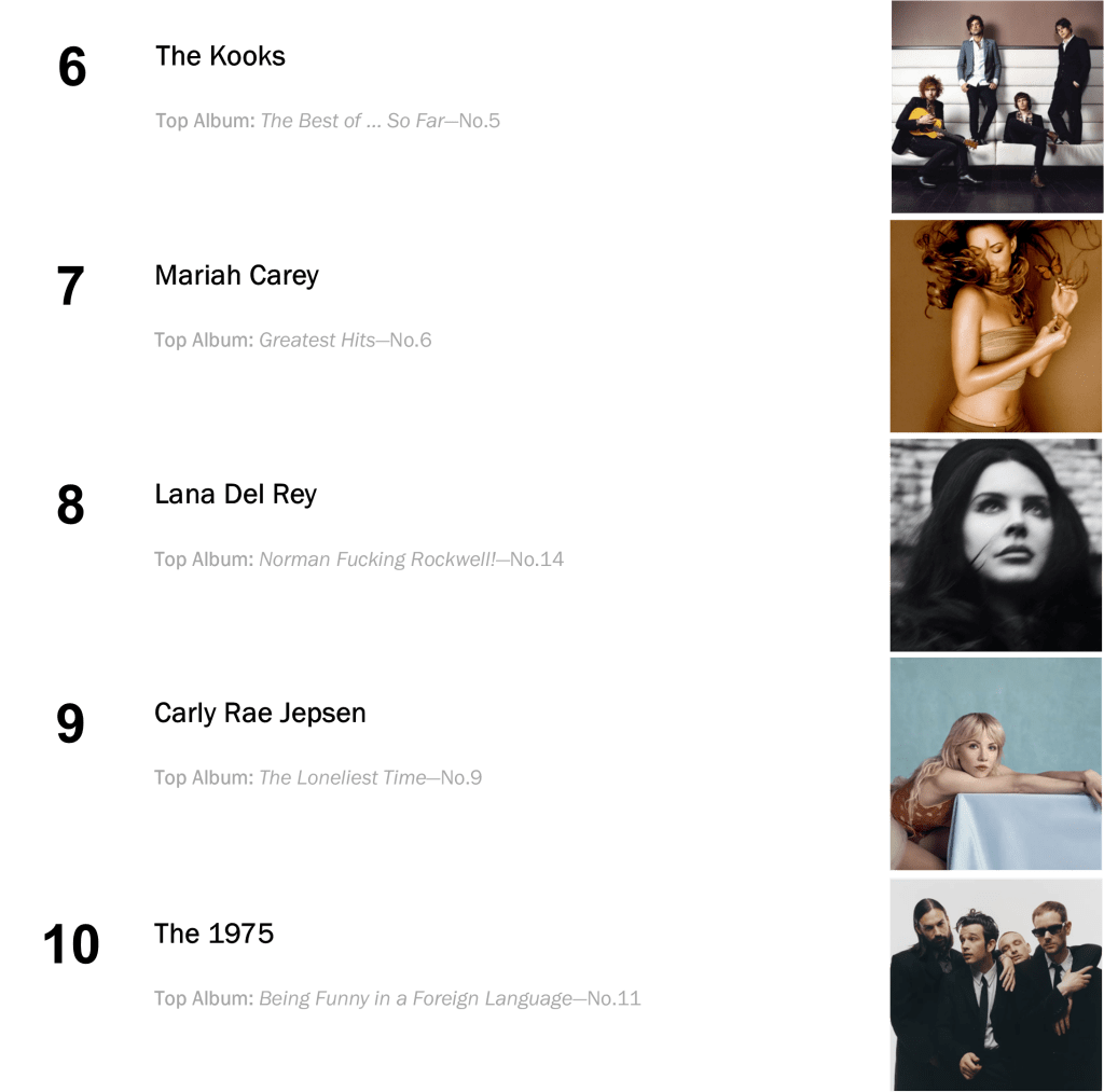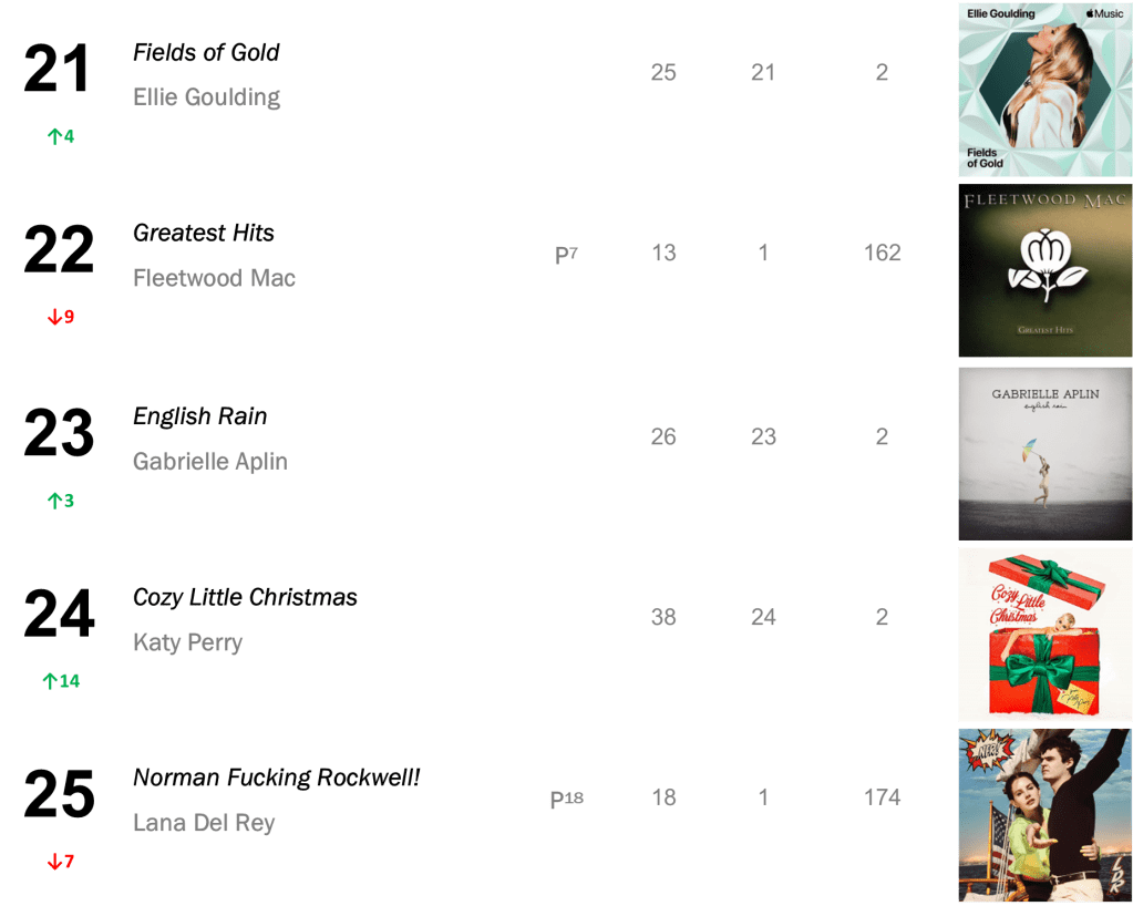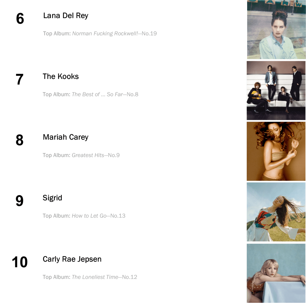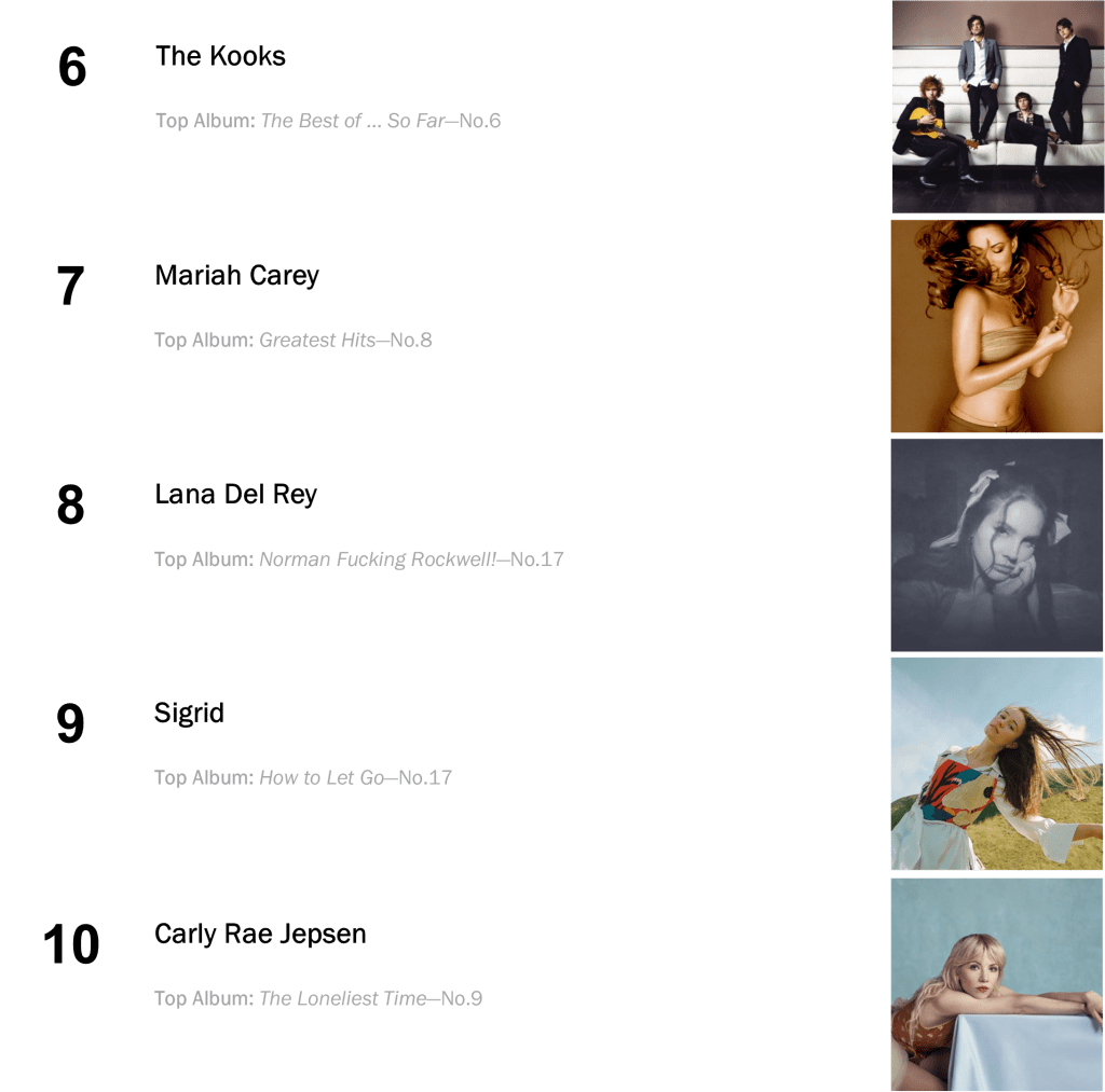 Outside the Top Five: The Kooks’s No.3-peaking The Best of … So Far holds at No.6 (24,000 units – up 3 percent), while Lana Del Rey’s Norman Fucking Rockwell! retreats 7-8 (21,000 units – even with last week). The latter album collects a record-extending 136th week inside the Top Ten!
