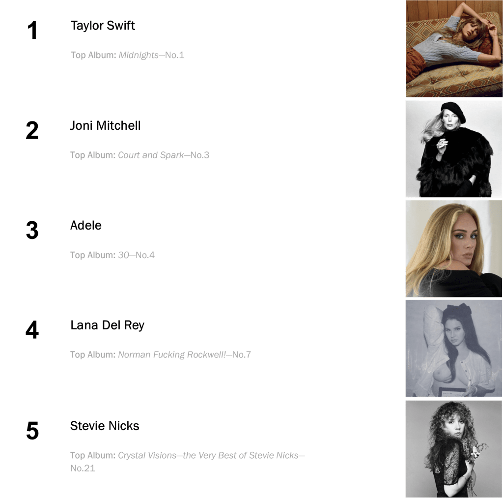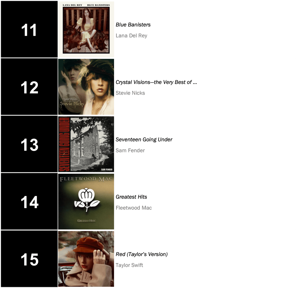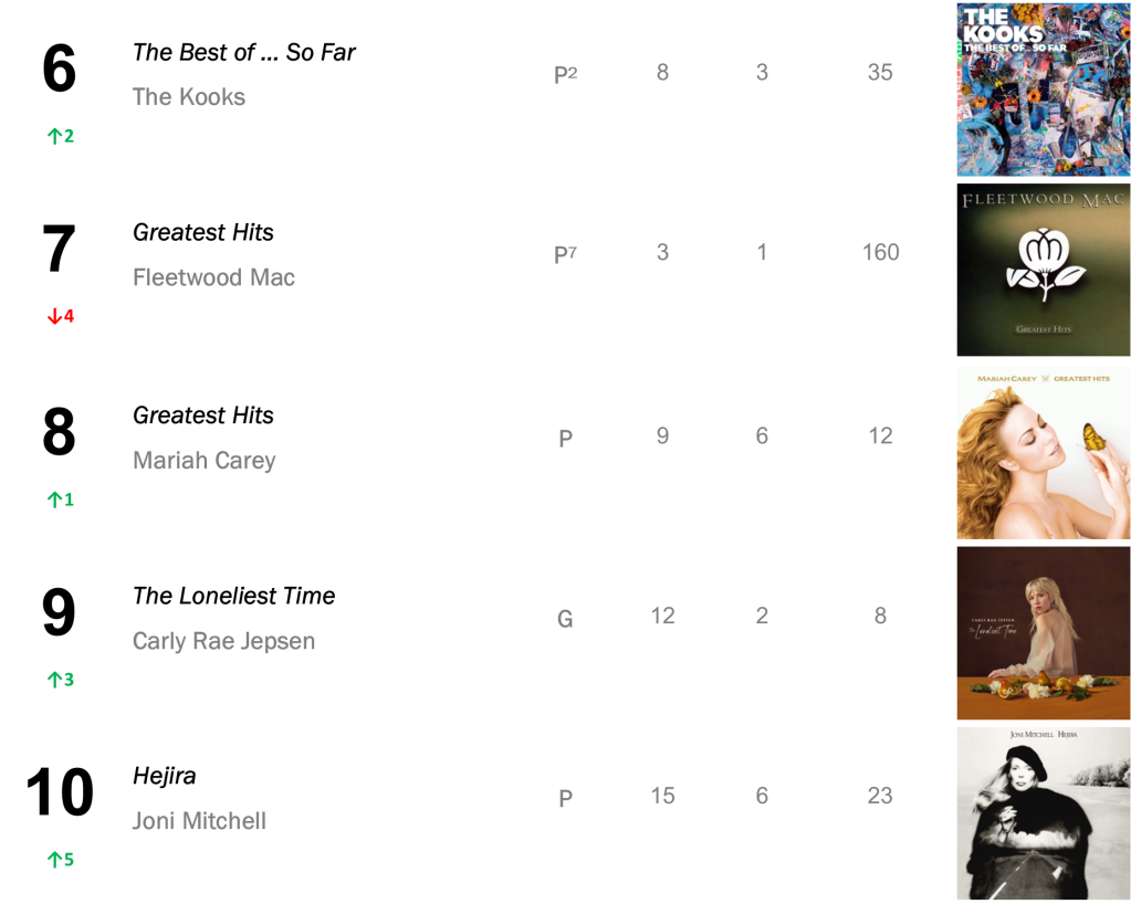 Midnights is now tied with Lana Del Rey’s Lust for Life as the sixth-longest-running number-one album of all time! It currently sits just behind Lady Gaga & Bradley Cooper’s A Star is Born – OST, and Joni Mitchell’s Court and Spark which have both ruled for a total of twelve weeks.