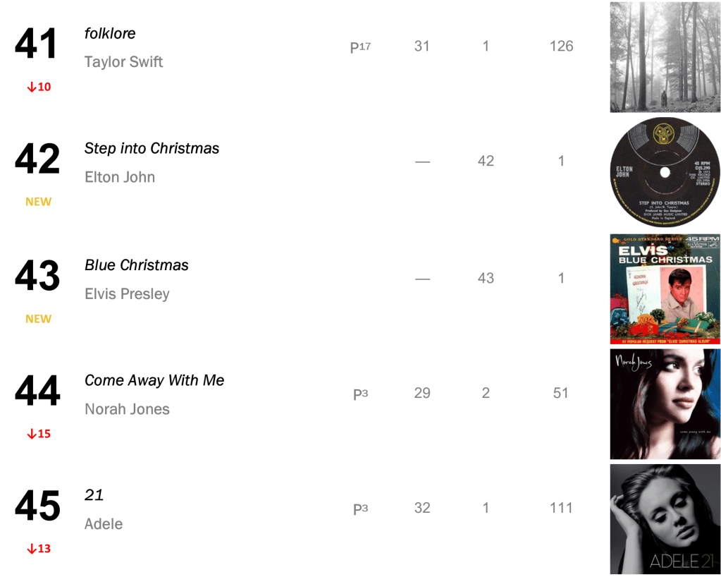 Swift also nabs the No.2 spot this week with fifteen-week-leader evermore, on sales of 63,000 units (down 6 percent); her seventeen-week-chart-topper folklore is also down 8-10 with 19,000 sold (on par with last week).