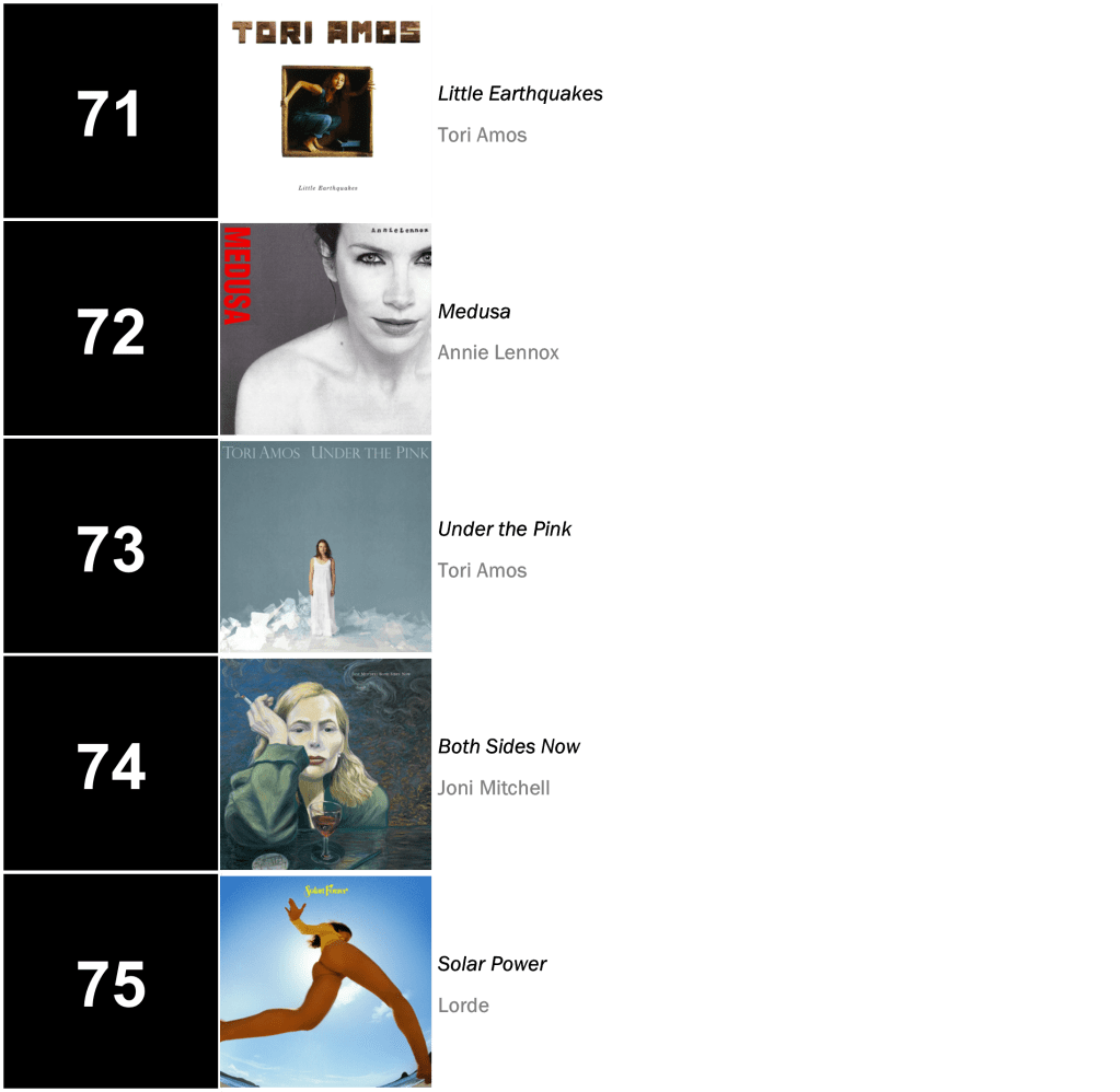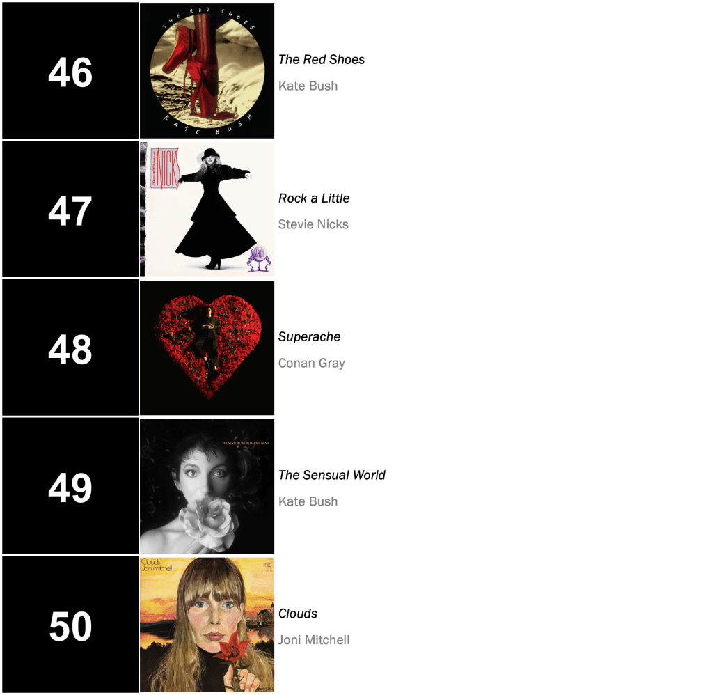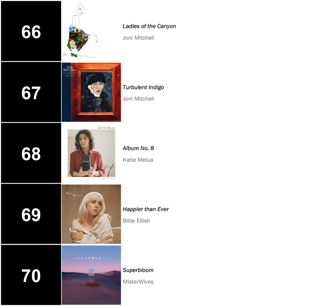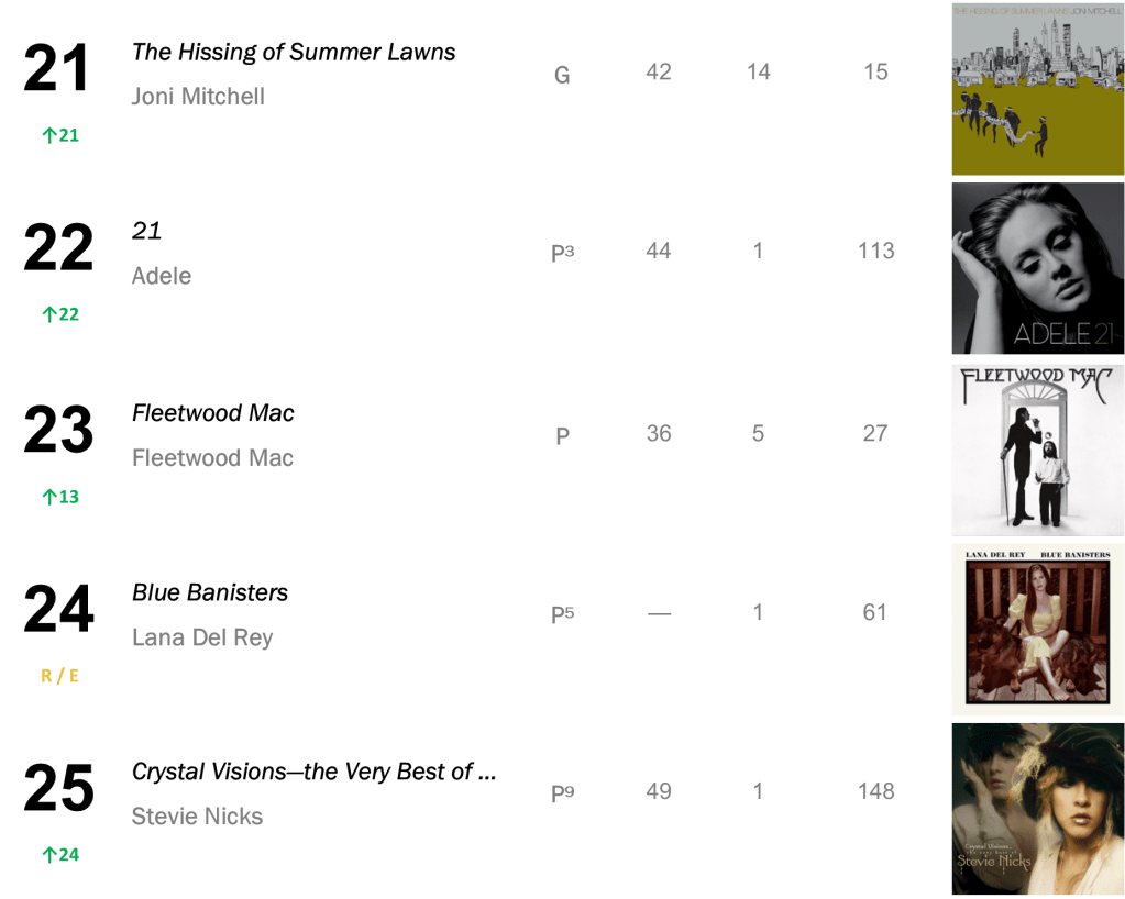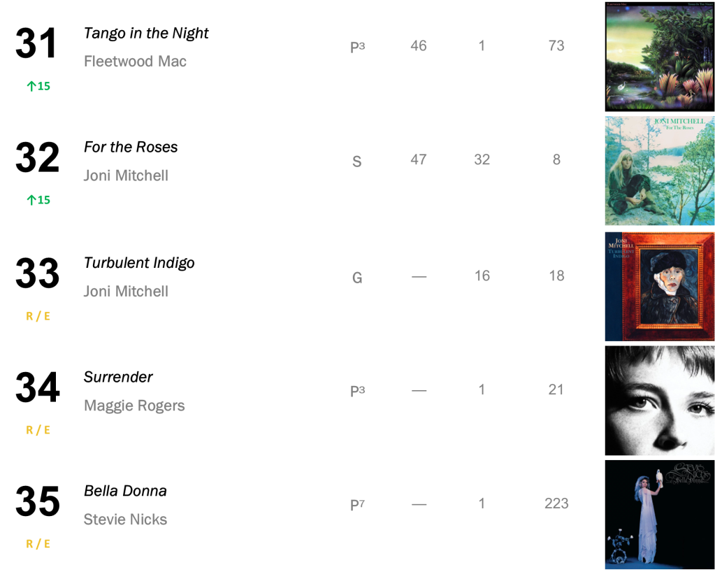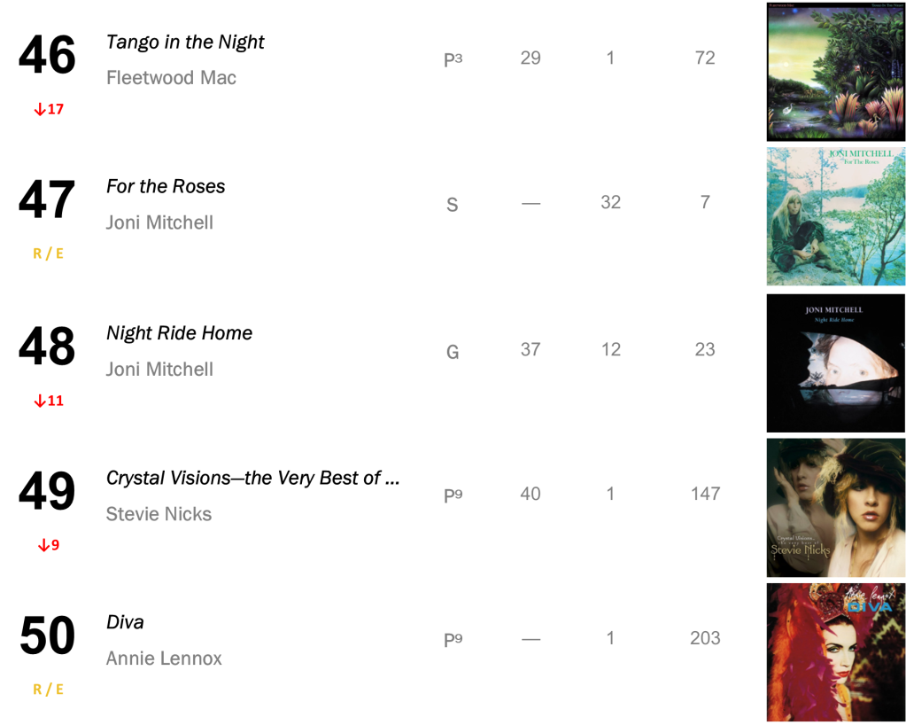 Joni Mitchell’s Court and Spark holds at No.3 with 45,000 sold (down 2 percent). Mitchell’s Hejira also bounces 9-7 after reaching No.6, shifting 23,000 copies (up 27 percent).