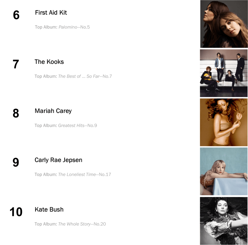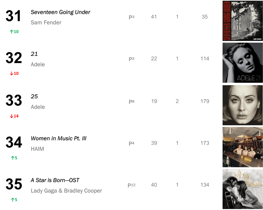 Adele’s seventeen-week-ruler 30 keeps at No.4 with 39,000 sold (up 2 percent); and First Aid Kit’s Palomino stays at No.5 after peaking at No.2, selling 31,000 units (up 24 percent).