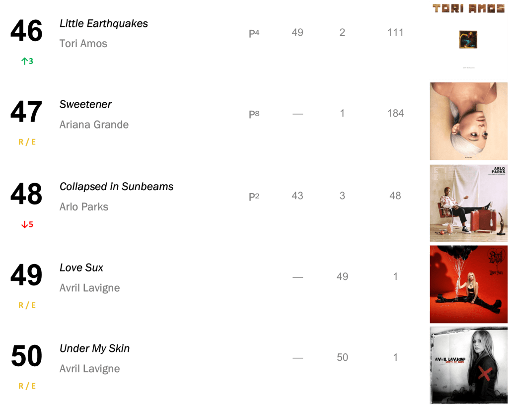 Arlo Parks’s debut album Collapsed in Sunbeams hurtles 48-9 to score its first Top Ten appearance since March 2022. The album moved 20,000 copies (up 300 percent) following the release of Park’s new single, “Weightless”. The song trailers the singer’s upcoming sophomore album, My Soft Machine – due May 26th.