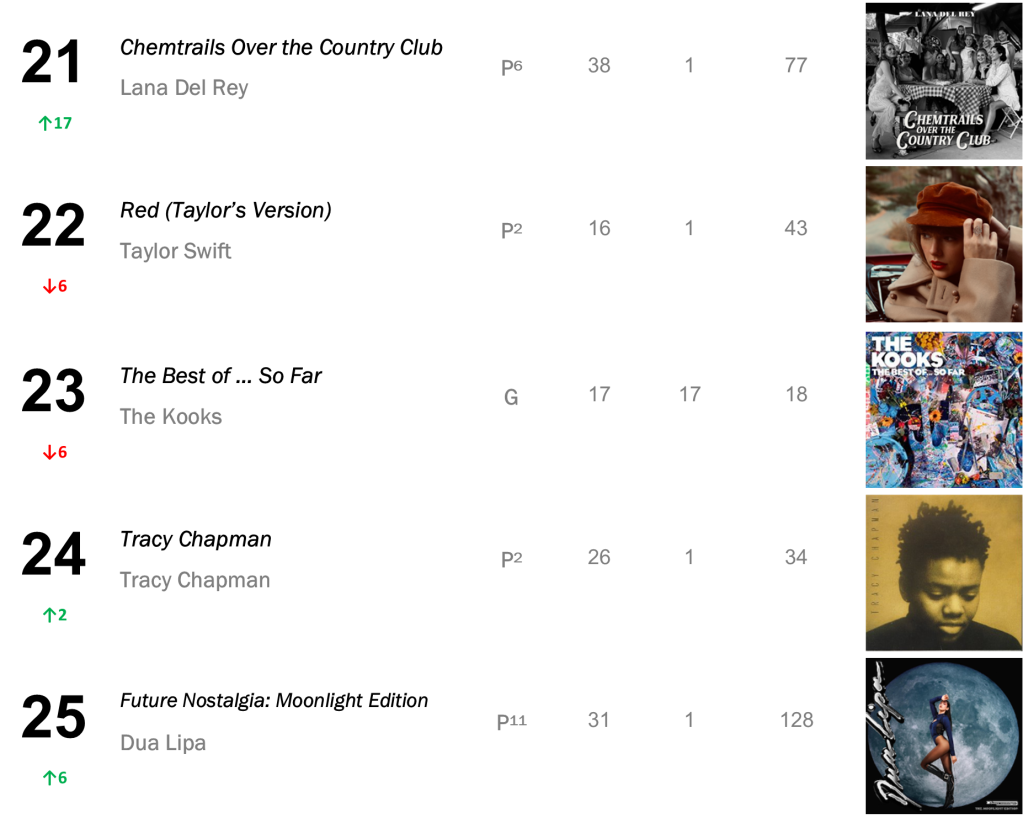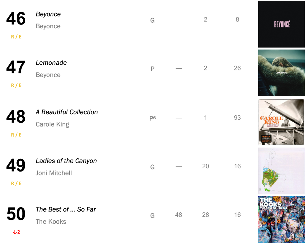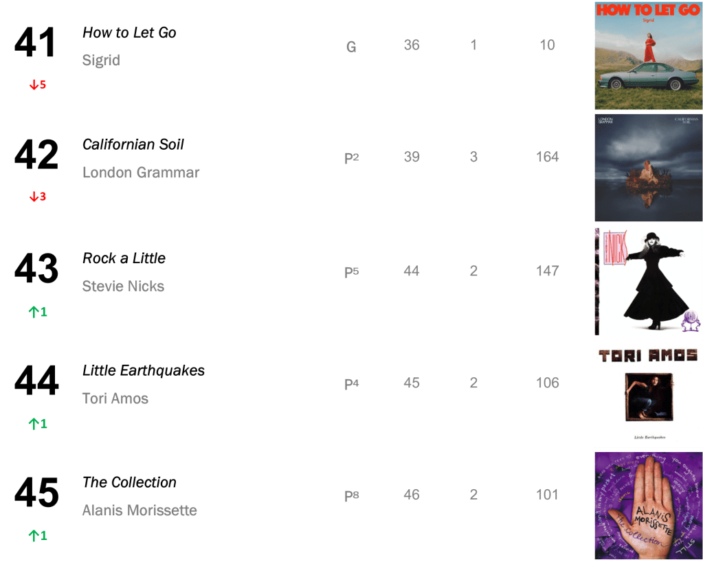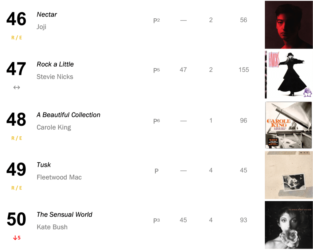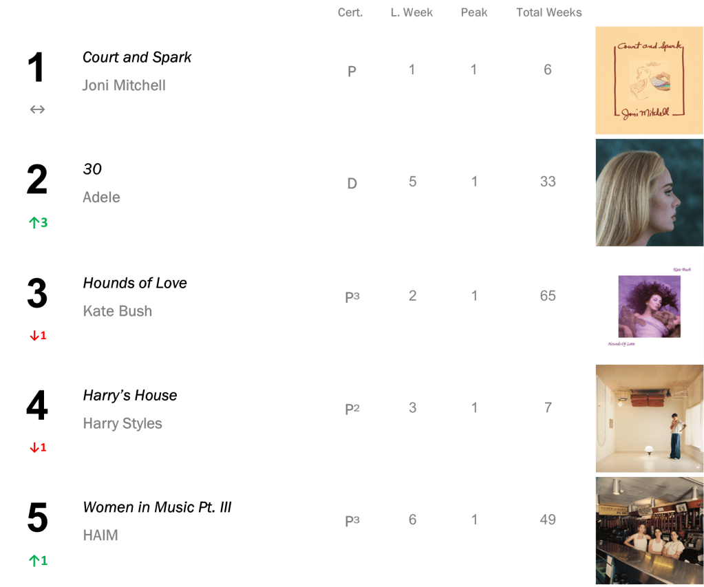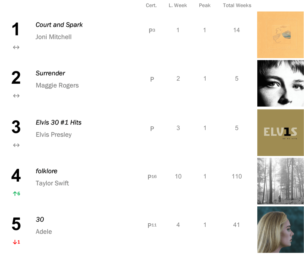 Joni Mitchell’s Court and Spark has now spent a total of eight non-consecutive weeks atop the L.dK Top 50, tying with Dua Lipa’s Future Nostalgia & Halsey’s If I Can’t Have Love, I Want Power as the eighth longest-running number one album of all time. The hit sold 71,000 this week (down 1 percent).