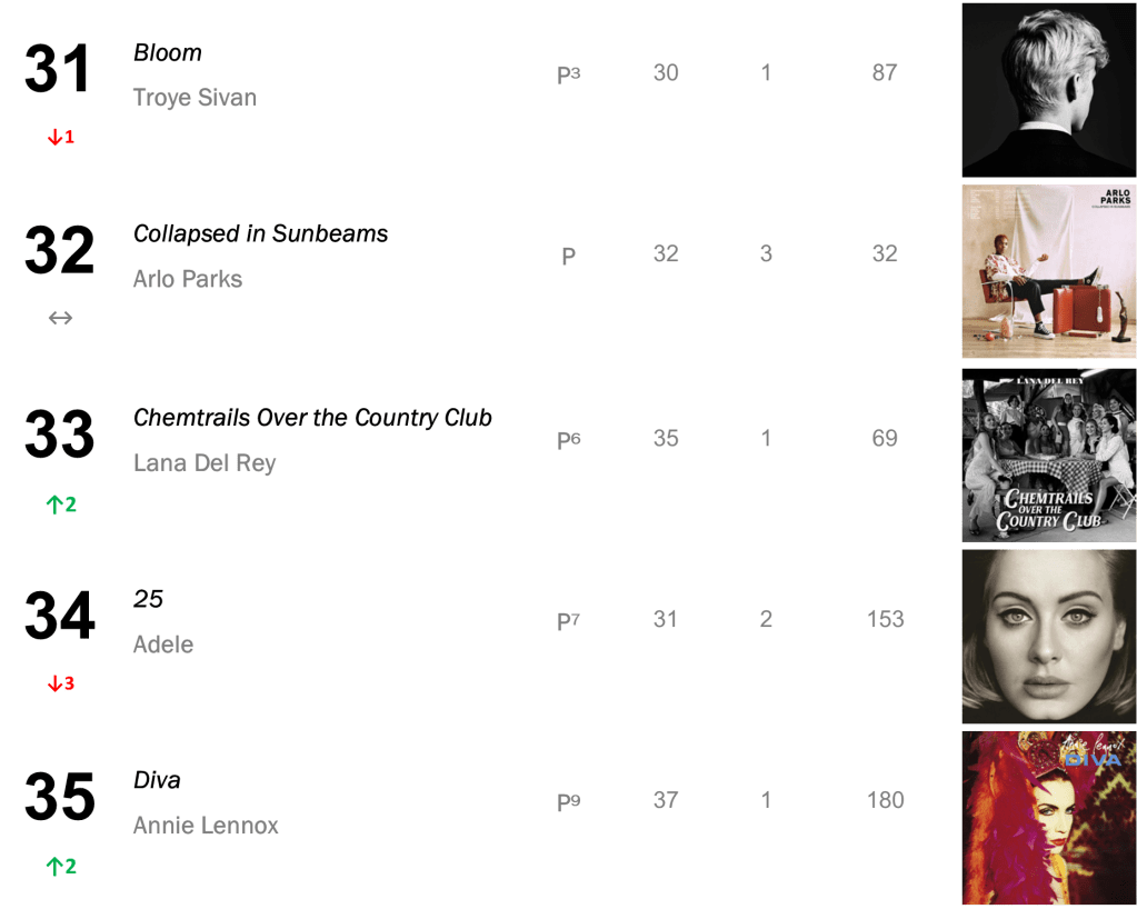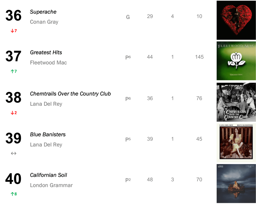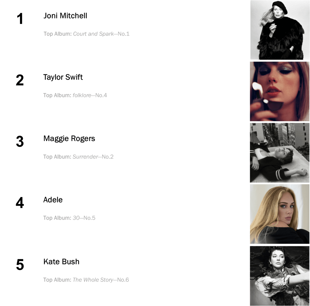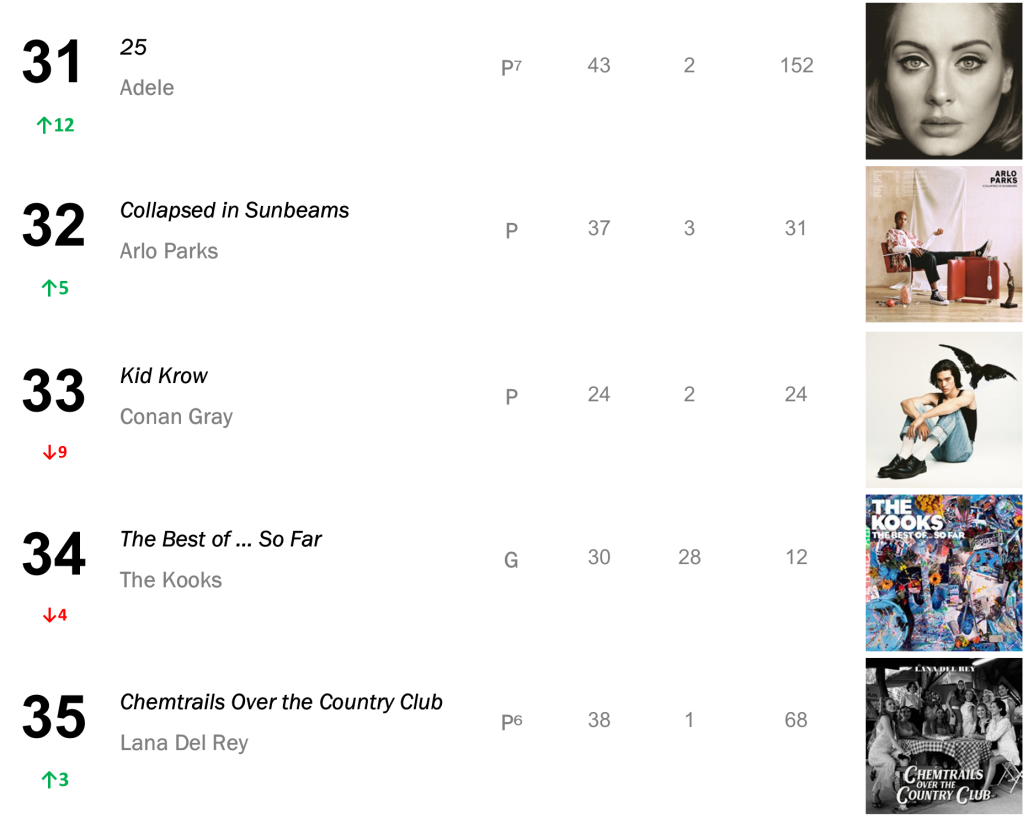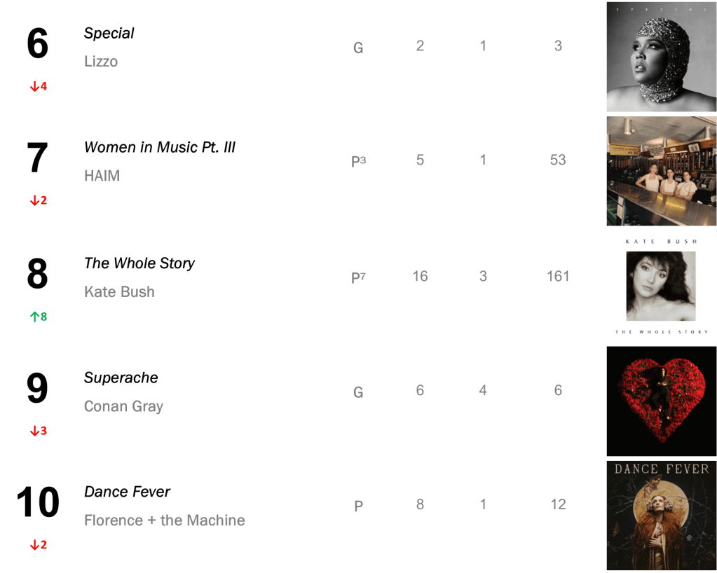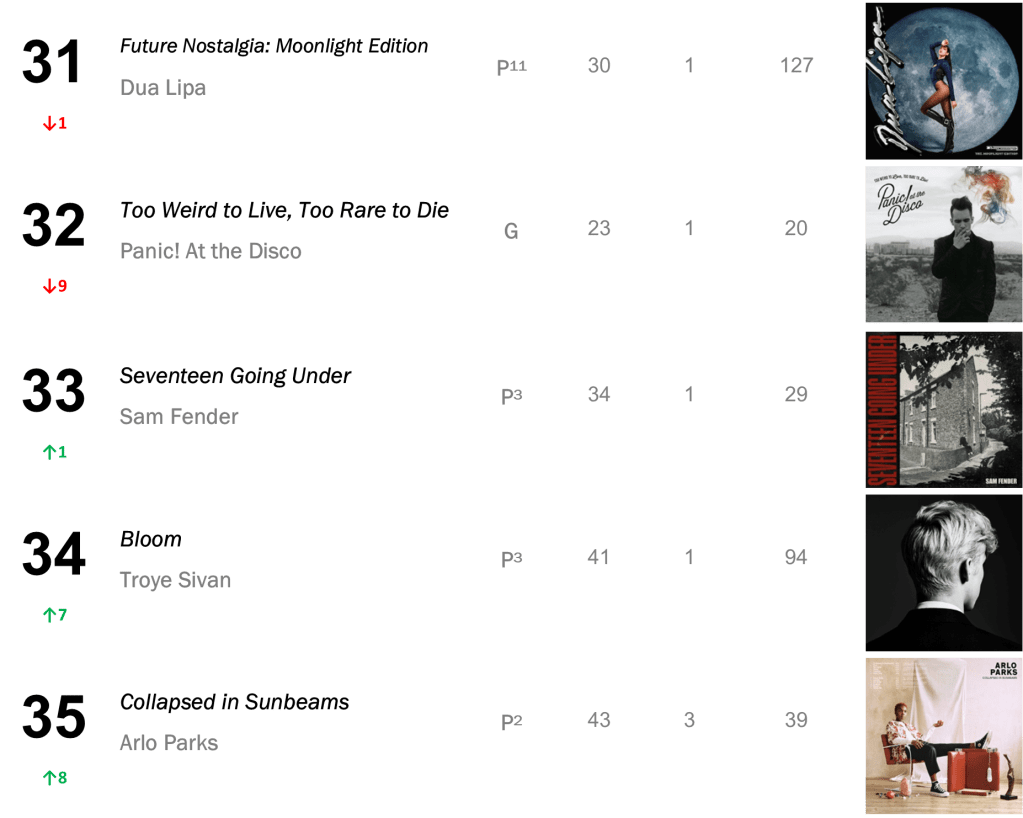 Joni Mitchell’s Court and Spark has now spent a total of eight non-consecutive weeks atop the L.dK Top 50, tying with Dua Lipa’s Future Nostalgia & Halsey’s If I Can’t Have Love, I Want Power as the eighth longest-running number one album of all time. The hit sold 71,000 this week (down 1 percent).