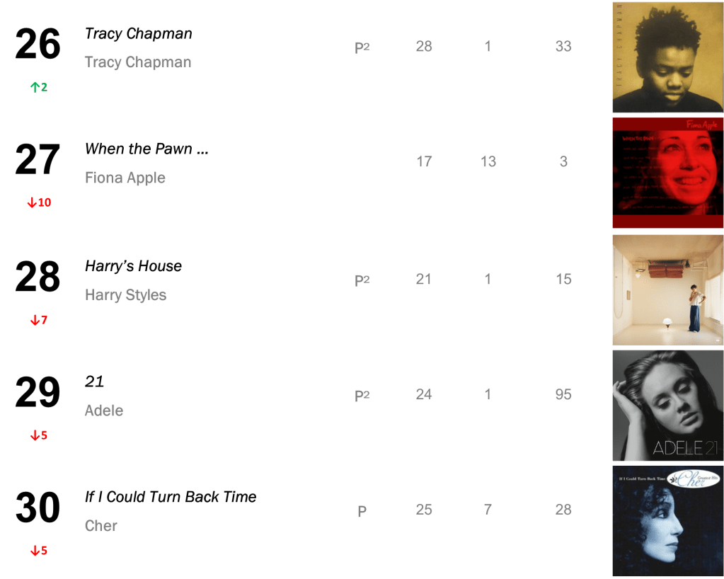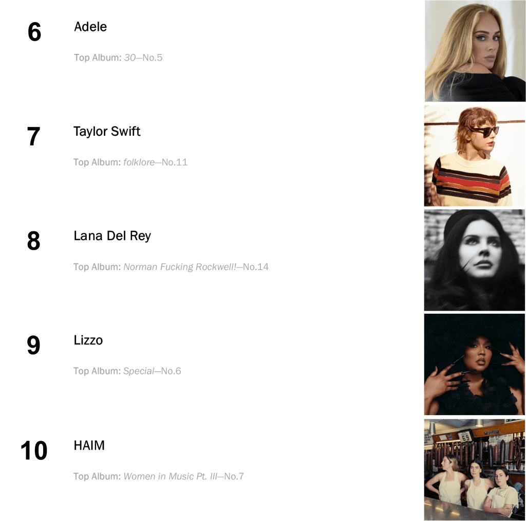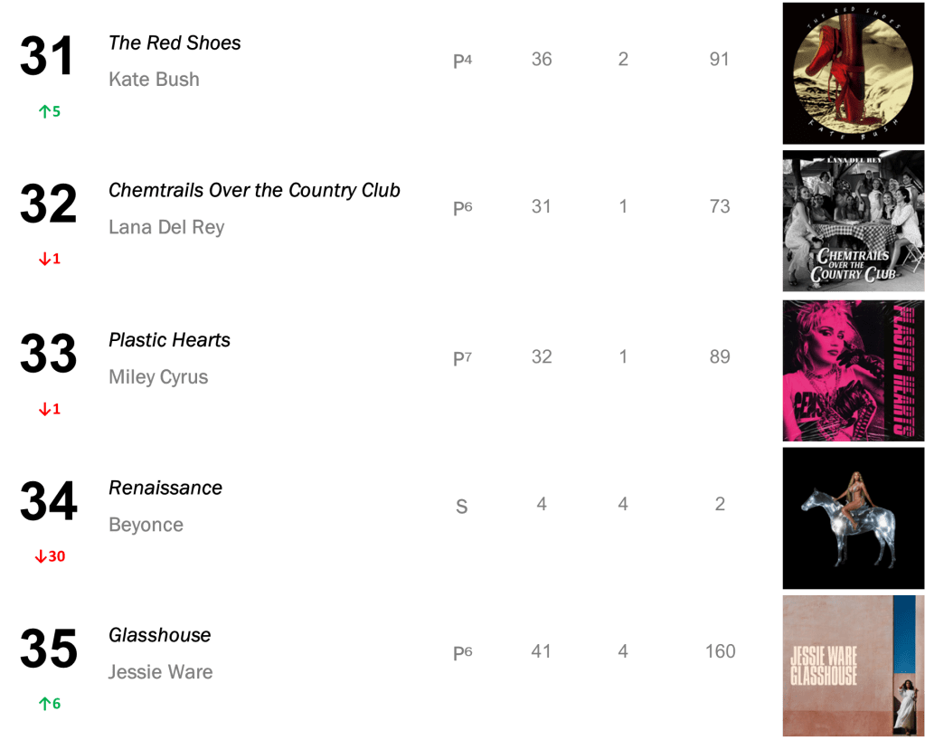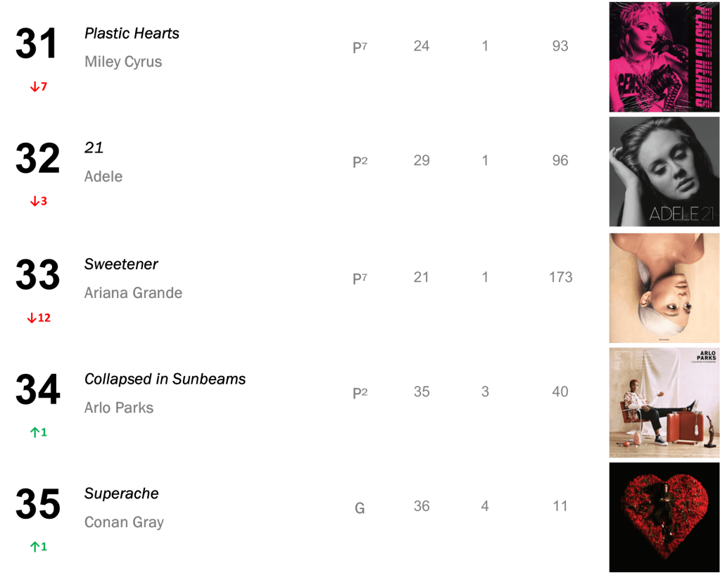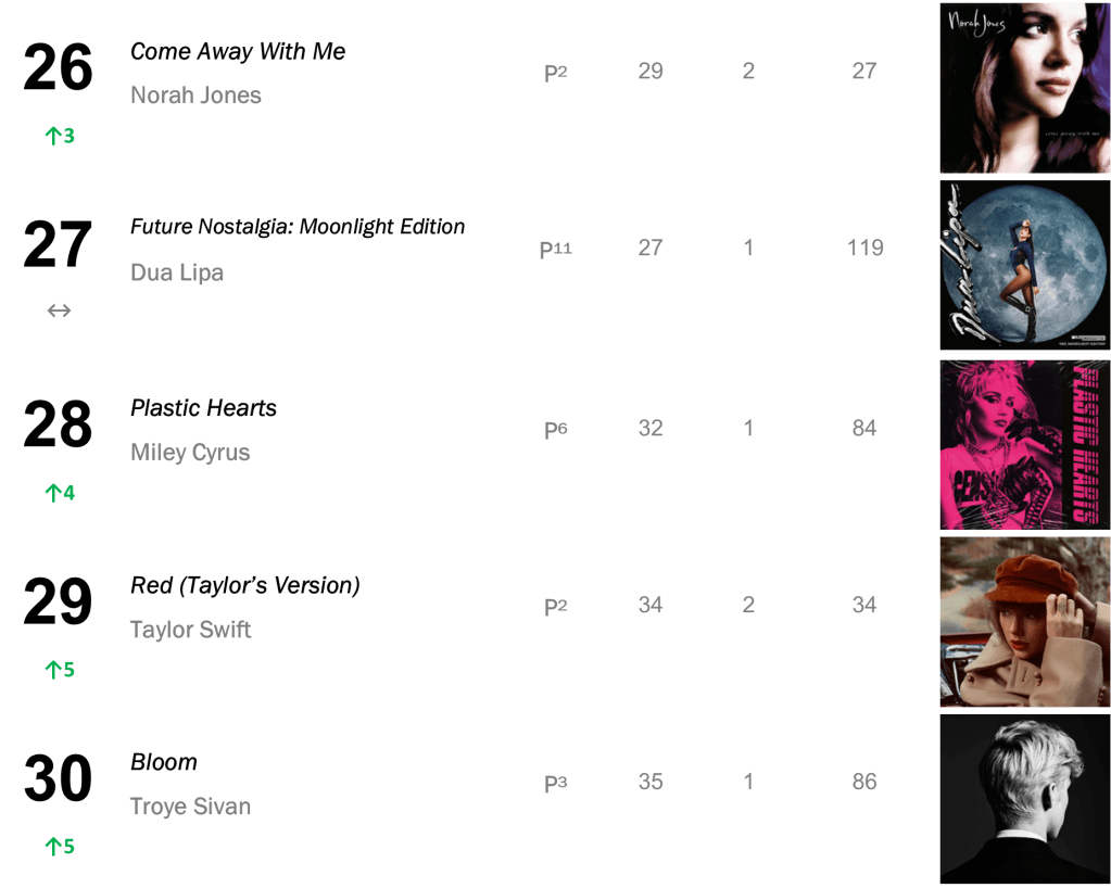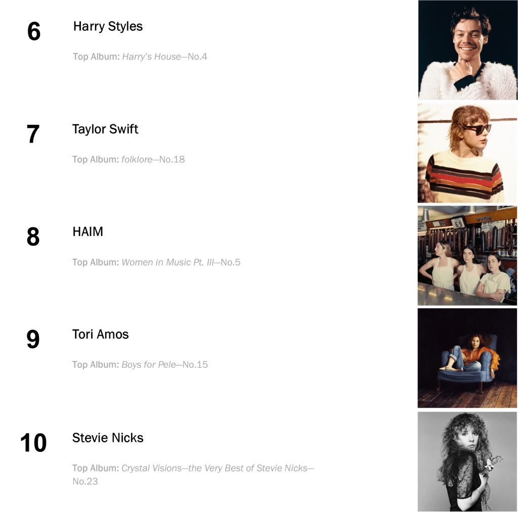 Joni Mitchell’s Court and Spark has now spent a total of eight non-consecutive weeks atop the L.dK Top 50, tying with Dua Lipa’s Future Nostalgia & Halsey’s If I Can’t Have Love, I Want Power as the eighth longest-running number one album of all time. The hit sold 71,000 this week (down 1 percent).