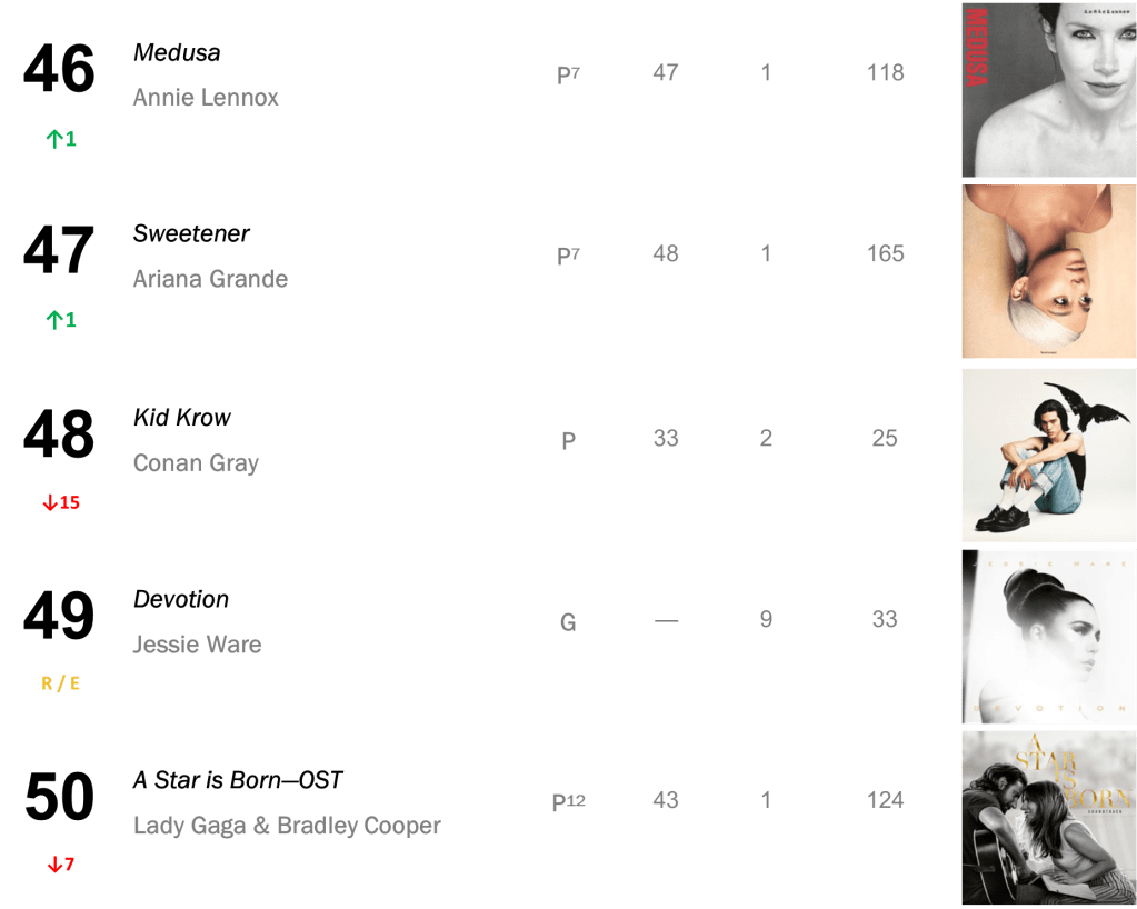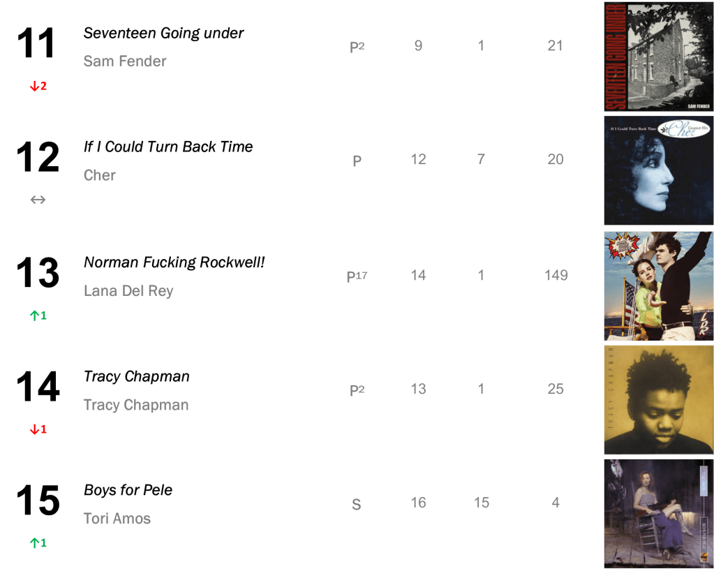 Lana Del Rey’s Norman Fucking Rockwell! descends 7-10 as it logs a record-padding 131st week inside the Top Ten (20,000 units – down 29 percent).