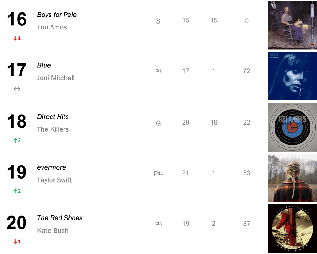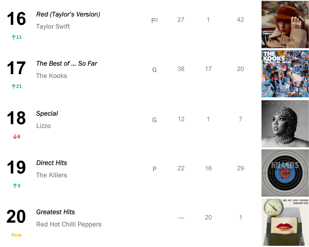 Two historic records from Taylor Swift rank back to back, with folklore falling 4-8 (23,000 units – down 47 percent), and evermore leaping 11-9 (23,000 units – up 4 percent).