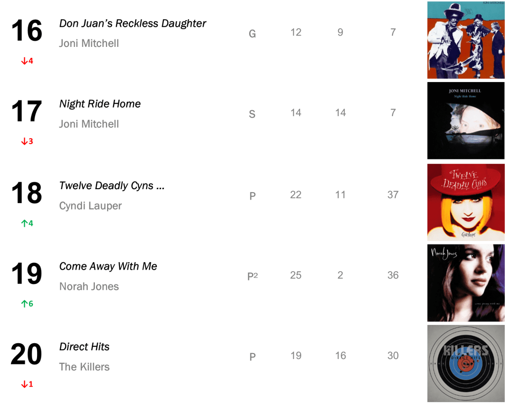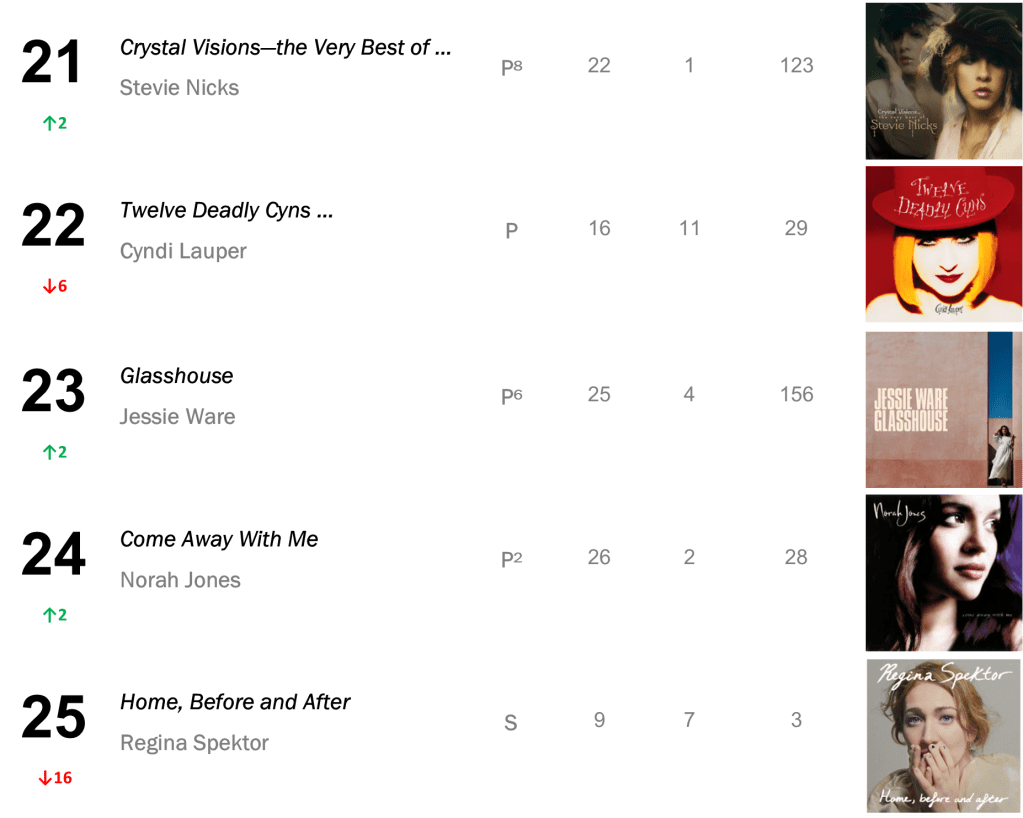 Mitchell’s Hejira also lifts 8-7 for a new Top 50 peak, selling 24,000 this week (down 7 percent).