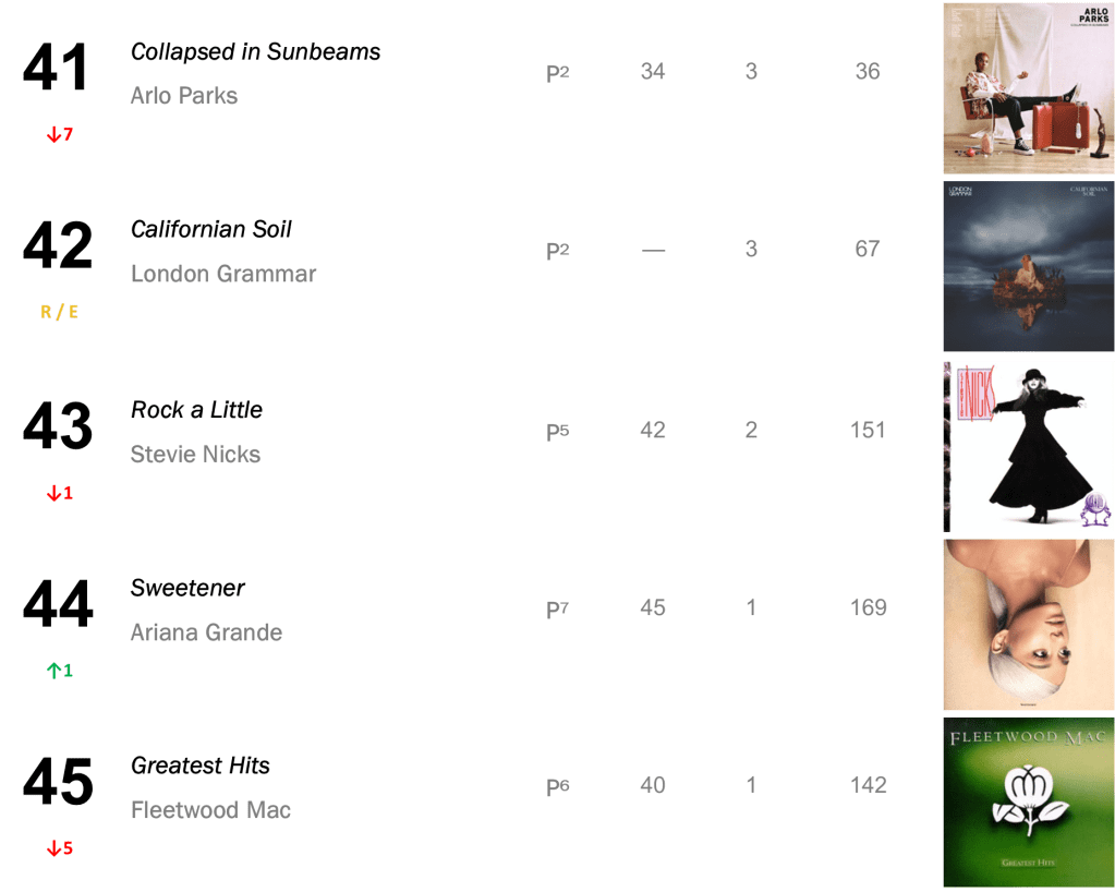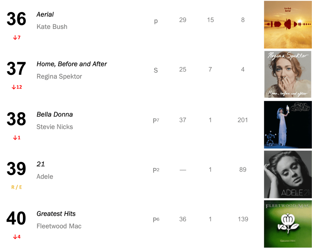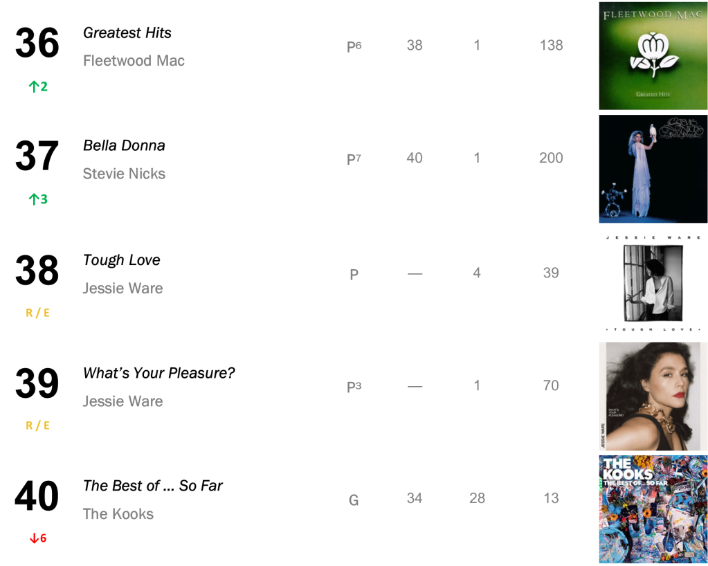 No.15 – Greatest Hits / Fleetwood Mac’s 1988 best-of set bolts 37-15 this week, following a Deep Discog Dive focused on the band. The collection sold 15,000 this week, and has sold 1.94 million to date.