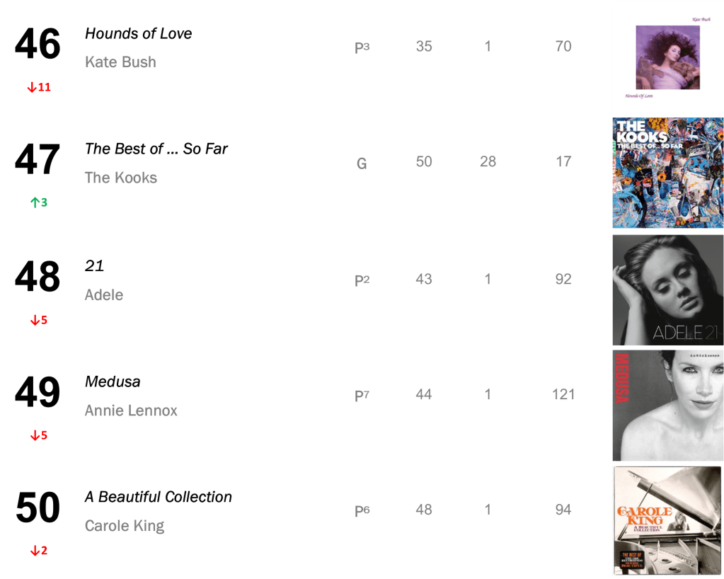Kate Bush’s The Whole Story maintains its rank of No.6 (30,000 units – down 7 percent).