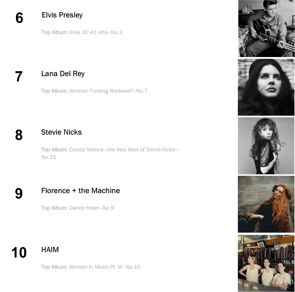 Three chart-topping hits follow inside the Top Five: Maggie Rogers sticks at No.2 with Surrender, selling 62,000 copies (even with last week); Elvis Presley repeats at No.3 on sales of 38,000 units (down 19 percent); and Adele’s 30 elevates 5-4 with 30,000 sold (down 12 percent).